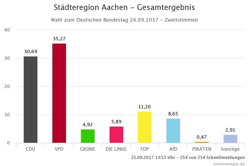 Stadt Monschau CDU (39,72% / -8,84) SPD (25,78 % / +1,74) FDP (13,95 % / +7,64) Grüne (6,54 % / -1,89) AfD (5,93 % / +2,74) Linke (5,47 % / +0,65) Gemeinde Roetgen CDU (33,90% / -10,65) SPD (24,42 % / -0,52) FDP (14,50 % / +8,41) Grüne (11,78 % / +0,28) Linke (6,58 % / +1,06) AfD (5,90 % / +2,98) Gemeinde Simmerath CDU (41,45% / -9,86) SPD (25,34 % / +0,95) FDP (13,45 % / +7,63) AfD (6,44 % / +3,20) Linke (5,30 % / +0,32) Grüne (5,26 % / -0,81) Den zweiten Aachener Wahlkreis sicherte sich hingegen Rudolf Henke von der CDU mit 33,73 Prozent und hielt damit Ulla Schmidt (SPD) mit 32,51 Prozent in Schach. Auch die Zweitstimmen gingen mehrheitlich an die CDU - hier landete die neu im Bundestag vertretene AfD mit knapp sechs Prozent »nur« auf Platz sechs. Im Kreis Düren gewann Thomas Rachel (CDU) mit rund 42 Prozent der Stimmen das Direktmandat - in Hürtgenwald (48,5%) und Nideggen (47%) war die Zustimmung sogar noch höher. Alle Ergebnisse gibt es unter http://wahlen.regioit.de