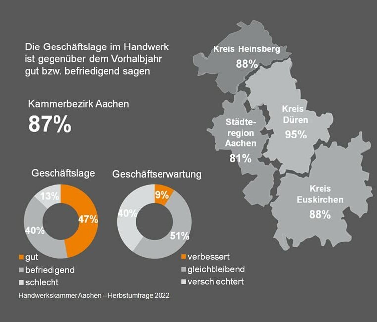 Region. »Die Handwerksbetriebe schauen grundsätzlich auf ein erfolgreiches Halbjahr zurück. Mit dem Andauern des Ukrainekriegs vergrößerten sich aber fast täglich die Herausforderungen, sodass die Betriebe inzwischen angesichts der Vielzahl von Krisen mit Sorge in die Zukunft blicken.» Das hat Peter Deckers, Hauptgeschäftsführer der Handwerkskammer Aachen (HWK), bei der Vorstellung der Konjunkturherbstumfrage heute unterstrichen. Erschwerend komme hinzu, dass die Unternehmen zunehmend Aufträge aufgrund der weiterhin vorherrschenden Liefer- und Materialengpässe stornieren oder neue Anfragen ablehnen müssten. »Trotz voller Auftragsbücher kann sich diese Bündelung äußerst negativer externer Faktoren mittel- bis langfristig auch auf den Arbeitsmarkt auswirken«, führt Deckers weiter aus.