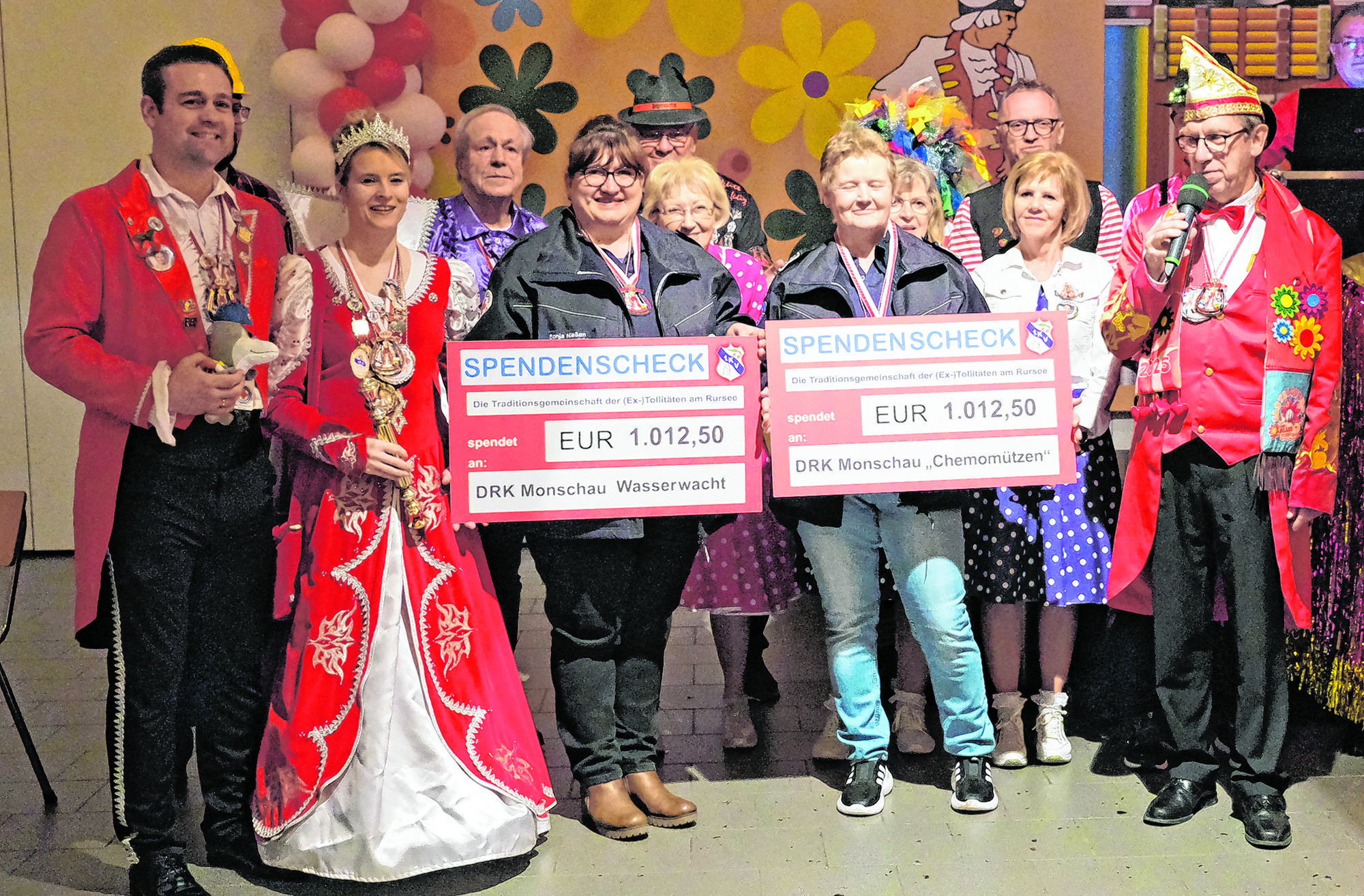 Rurberg. In diesem Jahr ging die Spende der »Traditionsgemeinschaft der Ex-Tollitäten am Rursee« an zwei Initiativen des Deutschen Roten Kreuzes (DRK), Ortsgruppe Monschau. Die Spende in Höhe von 2025 Euro ging jeweils zur Hälfte an die DRK-Wasserwacht sowie an das Projekt »Chemomützen«, über das vor einigen Wochen im WochenSpiegel berichtet wurde.
