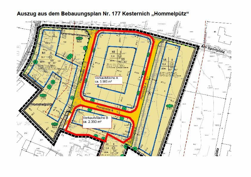 Die Gemeinde Simmerath hat für den Bereich am bisherigen Sportplatz in Kesternich einen Bebauungsplan aufgestellt und somit die Flächen in Bauland umgewandelt. Diese werden nun zum Verkauf angeboten. Die beiden Grundstücksflächen werden von dem Bebauungsplan Nr. 177 »Hommelpütz« der Gemeinde Simmerath erfasst, der eine zweigeschossige Bebauung als Mischgebiet ausweist. Die Grundstücke sind nicht erschlossen. Die Erschließung erfolgt nicht gemeindeseitig. Alle mit der Ersterschließung verbundenen Kosten trägt der Käufer. Der Verkauf erfolgt gegen Höchstgebot. Zusätzlich zum angebotenen Kaufpreis hat der Käufer alle mit dem Ankauf verbundenen Kosten (Notar, Umschreibung, Grunderwerbsteuer) sowie die Vermessungskosten zu übernehmen. Beide Grundstücksflächen werden nur zusammen verkauft. Für weitere Auskünfte steht Günter Kaulen im Rathaus Simmerath, Zimmer U3, Tel. 02473/607-177 oder per E-Mail an guenter.kaulen@gemeinde.simmerath.de zur Verfügung. Interessenten, die ein Kaufangebot abgeben möchten, übersenden dieses bitte in einem verschlossenen Umschlag mit der Aufschrift »Kaufangebot Grundstücke Kesternich, Hommelpütz« bis Freitag, 19. August, an die Gemeinde Simmerath, Rathaus, Strukturabteilung, 52152 Simmerath.