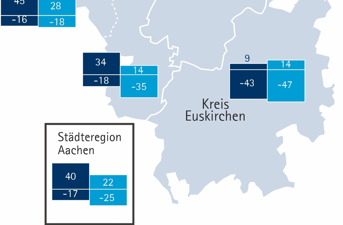 Im ehemaligen Kreis Aachen haben sich die negativen Lagebewertungen erhöht, der Saldo bleibt aber auch dort positiv. 36 Prozent der Befragten sind mit ihrer Lage zufrieden, 18 Prozent melden schlechte Geschäfte. Die Aussichten haben sich hingegen deutlich eingetrübt: Nur noch 14 Prozent der Befragten erwarten eine positive Entwicklung, 35 Prozent rechnen mit schlechteren Geschäften.