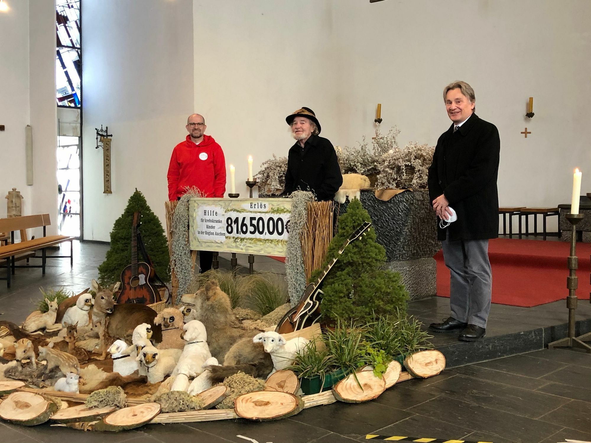 Dass es Reiner Jakobs gelungen ist auch in der Corona-Pandemie stolze 81.650 Euro für krebskranke Kinder zu sammeln, macht den Mediziner fassungslos. »Viele Spendenaktionen fielen aus, obwohl wir sie in dieser Zeit ganz besonders benötigen«, so Kontny. Die gesundheitliche Auswirkung des Corona-Virus auf seine Patienten sei zwar sehr gering. »Aber der soziale Aspekt und die Psyche leiden immens«. Es darf nur ein Elternteil ständig beim schwerkranken Kind im Klinikum bleiben, Geschwistern oder Großeltern ist der Besuch nicht gestattet. »Dazu dann die schwierigen Bedingungen, wenn Schule oder Kita geschlossen sind«, so Kontny. Auch eine freundliche Geste des Personals oder eine liebevolle Umarmung sei wegen Maskenpflicht und Abstandgebot nicht möglich. Dem »singenden Hirten«, Reiner Jakobs, stehen die Tränen in den Augen. »Ich bedanke mich bei allen, die mich so tatkräftig unterstützt haben«, erklärt er und ist selbst ungläubig, dass es auch ohne Gesang und mit deutlich kleinerer Krippe dieses Spendenergebnis geworden ist. Vereine und Unternehmen aus der Region hatten mehr denn je gespendet. »Sechsmal habe ich eine Krippe aufgebaut«, erinnert er sich an die Weihnachtszeit zurück. »Ich hatte ja Zeit«, schmunzelt er und wünscht sich vor allem eines: »Dass nächstes Jahr wieder alles normal ist.« Und weil er in der Kirche nicht zur Gitarre greifen darf, lädt der »Singende Hirte« zum spontanten Abschluss-Ständchen vor das Gotteshaus ein.