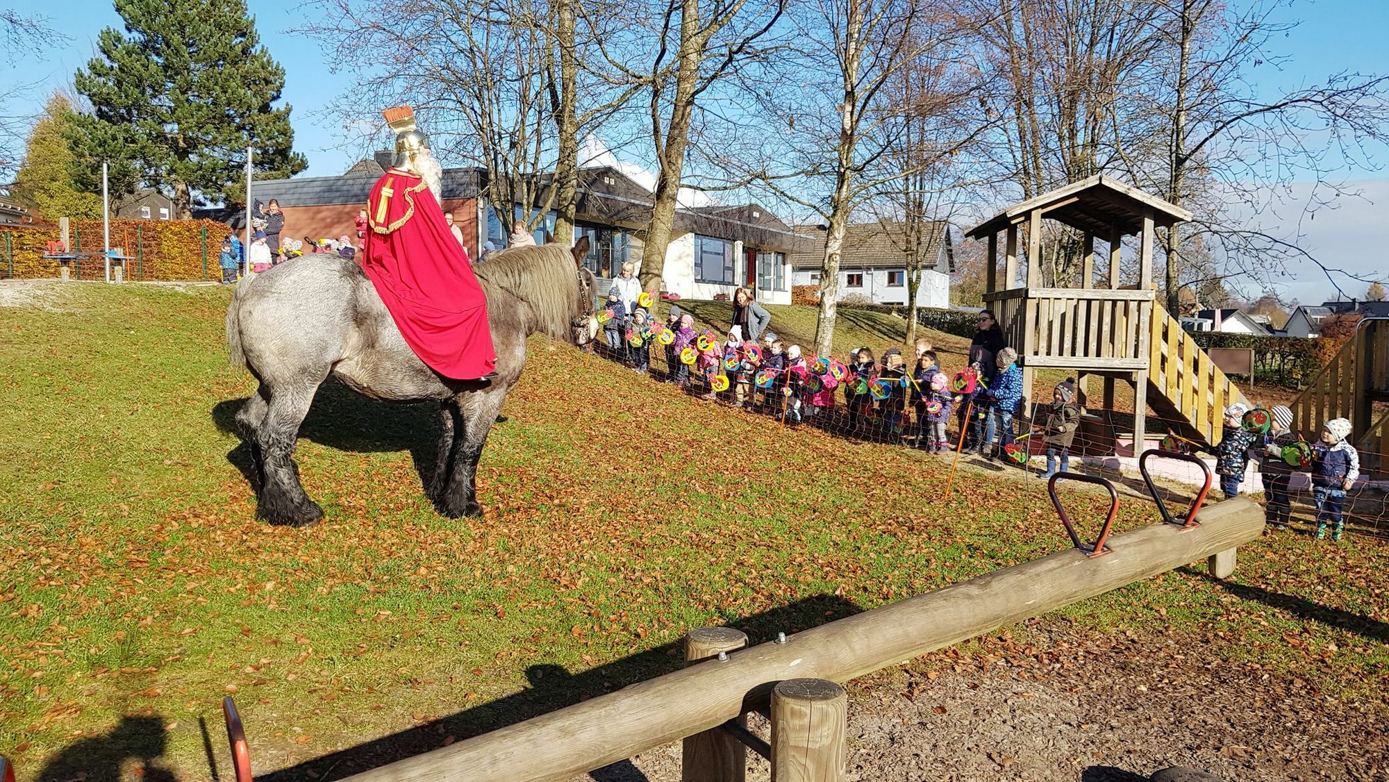 Wegen der Corona-Pandemie und den damit verbundenen Sicherheitsmaßnahmen müssen die Umzüge in diesem Jahr ausfallen. Doch es gibt kreative Alternativen, sowie in Mützenich. Der St. Martin besuchte am Mittwoch vormittag die Kinder in der Grundschule und im Kindergarten. An der Schule reihten sich ein paar Gruppen mit gebastelten Laternen auf dem Schulhof um den reitenden St. Martin. Die Schulleiterin Gertrud Faymonville under Sankt Martin sagten den Kindern einige Worte und erklärten ihnen die veränderte aber gelungene Alternative. Die Kinder waren aber begeistert und klatschten dem St. Martin zu. Anschliessend ritt er zum Kindergarten. Hier bildeten die Kindergärtnerinnen und Helferinnen Kleingruppen. Mit extra selbstgebastelten Laternen und Fackeln reihten sie sich im Freien an abgrenzenden Zäunen. „Der Martinsmann hat gesagt, dass er unbedingt kommen will, weil er es so schön findet, die strahlenden Augen der Kinder zu sehen", so Ortsvorsteherin Jacqueline Huppertz und Kartellvorsitzender Franz Müller, die den St. Martin begleiteten." Das war uns einfach ein großes Anliegen: „Der Martinsmann kommt mit seinem Pferd zu den Kindern." Die Weckmänner, die er mitgebracht hatte als Geschenk wurden anschließend nach Corona Regeln in der Grundschule und im Kindergarten verteilt. Die Aktion fand großen Anklang bei Groß und Klein, denn wie ein Anwohner bemerkte: „ In unserer momentanen, schweren Zeit sollte man immer versuchen positive und schöne Momente zu zaubern“.