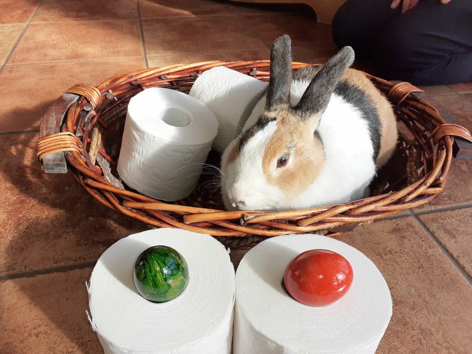 Damit Frieden in der Welt herrscht, sorgt der fleißige Hase ab sofort immer für reichlich Toilettenpapier in allen Supermärkten, nicht nur an Ostern.