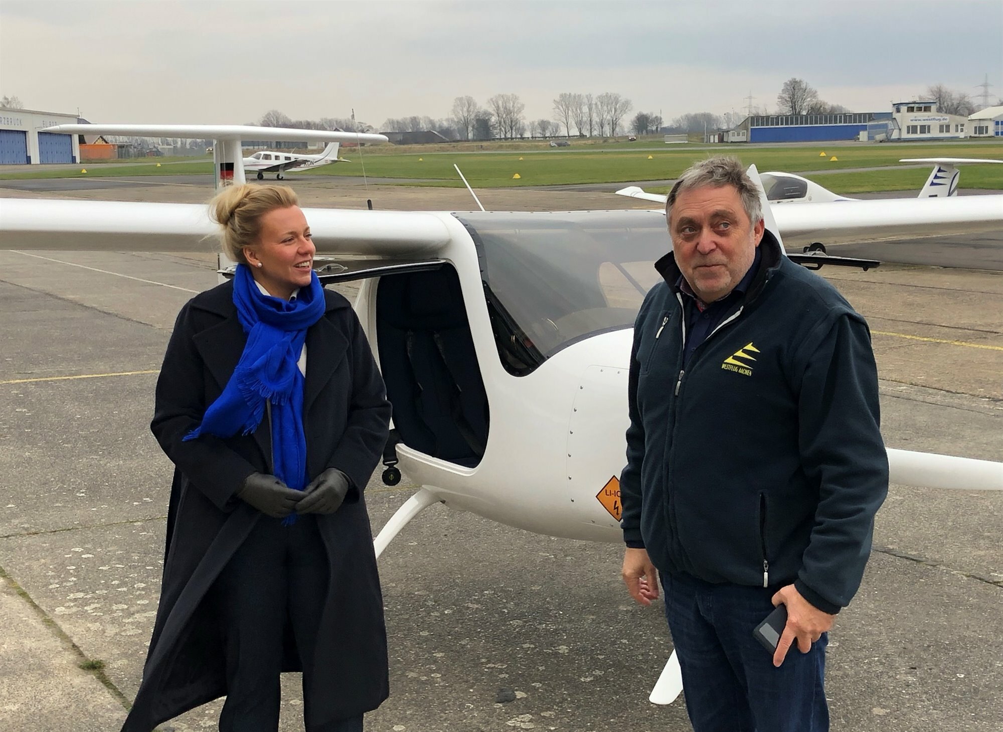 Region (Fö). Leises, geräusch- und emissionsarmes Abheben mit einem Motorflugzeug – das ist keine Zukunftsvision, sondern Wirklichkeit in Aachen-Merzbrück. Davon hat sich nun auch NRW-Verkehrsministerin Ina Brandes überzeugt. Es sei beeindruckend mit dem einzigen voll zugelassenen Elektroflugzeug der Welt, einem von zwei »Pipistrel Velis Electro« abzuheben und dabei keinerlei Belastungen für Anwohner zu erzeugen. » Leiser und sauberer Flugverkehr ist für hochverdichtete Ballungsräume besonders interessant«, weiß Brandes. Nur an der Heizung habe man gespart, scherzt sie nach einem halbstündigen Rundflug mit Westflug-Geschäftsführer Walter Kampsmann bei eisigen Temperaturen.
