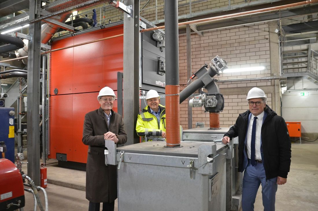 »Das ist ein wichtiger Meilenstein für unsere Energie-Gemeinde, die bereits heute 174 Prozent ihres Strombedarfs regenerativ erzeugt«, freut sich Bürgermeister Bernd Goffart. Das 2006 erbaute Heizwerk in der Walter-Bachmann-Straße in Simmerath wurde saniert und hat nun den Betrieb wieder aufgenommen. Betrieben von der STAWAG liefert die Anlage umweltfreundliche Wärme aus regionalen Holzhackschnitzeln. »Wir haben etwa 2,8 Millionen Euro investiert und mit den drei Mitarbeitern des bisherigen Betreibers reichlich Know-how übernommen«, erklärt Frank Brööse, Geschäftsführer der STAWAG Energie GmbH. »Unser Unternehmen setzt nicht nur bei der Stromerzeugung, sondern auch für den Wärmesektor konsequent auf Klimaschutz«, ergänzt STAWAG-Vorstand Dr. Christian Becker. Ein Wärmespeicher von 100 Kubikmeter sorgt dafür, dass die Energie nicht verpufft, wenn sie von den Abnehmern gerade nicht gebraucht wird. Mit der Anlage, die eine Leistung von 900 kw bringt und einen Wirkungsgrad von mehr als 90 Prozent erzielt, werden die Sekundarschule samt Sporthalle, das SimmBad, das BGZ samt im Bau befindlichen Gästehaus, das Berufskolleg samt Dreifachturnhalle, das Katastrophenschutz-Zentrum und die neue Fachhochschule versorgt. »Der TÜV hat keine Mängel festgestellt, die Anlage kann bis zu 72 Stunden ohne Beaufsichtigung laufen«, weiß Wolfgang Hyrenbach, Projektleiter der STAWAG. Für Zeiten der Spitzenlast steht ein neuer Ölbrenner mit einer thermischen Leistung von 3,5 Megawatt zur Verfügung.