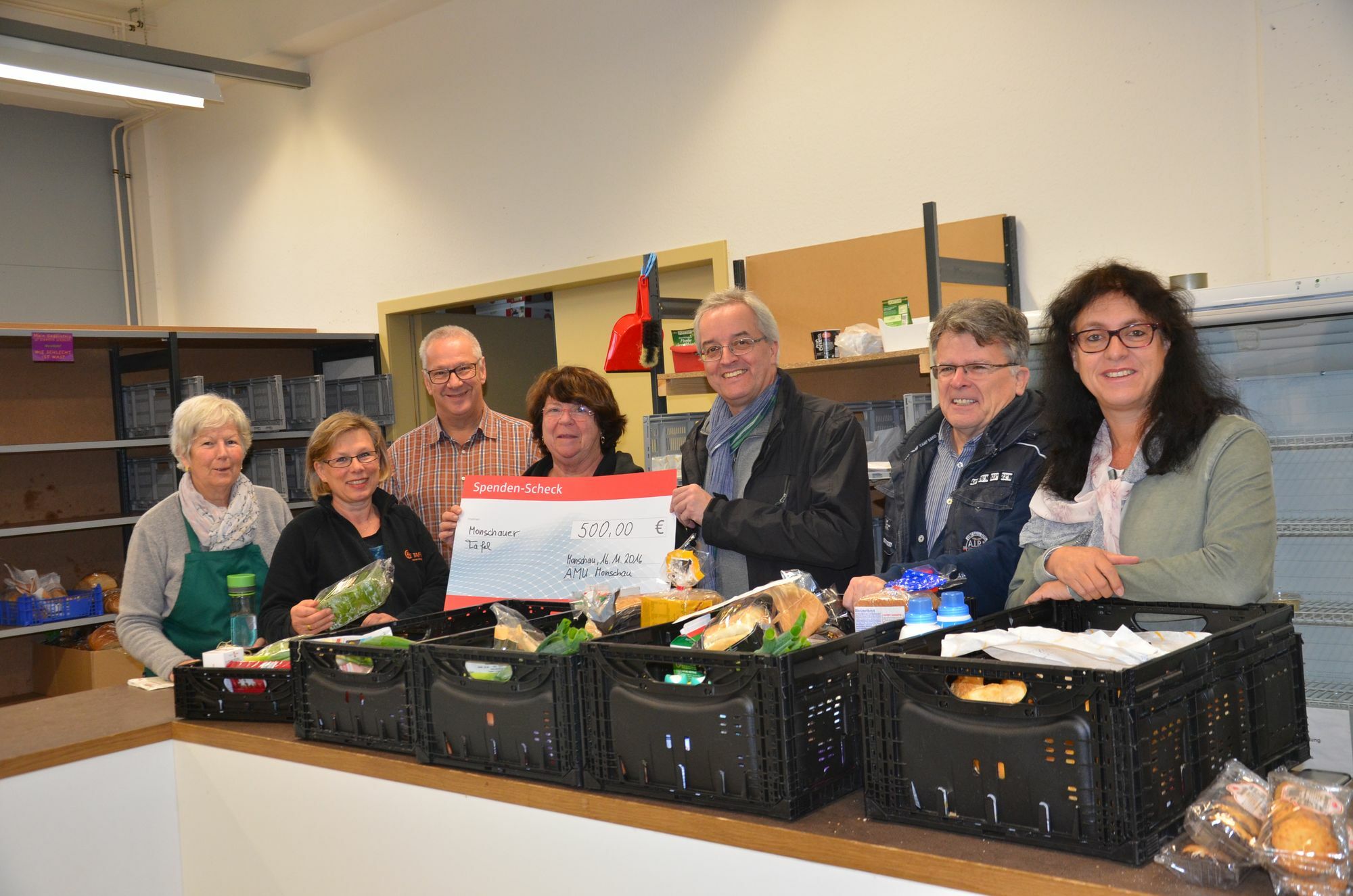 Mit 500 Euro unterstützen die Monschauer Unternehmer das Engagement der Monschauer Tafel. Das Geld stammt traditionell aus der großen Verlosungsaktion zum Monschauer Wirtschaftstag. Etwa 800 Menschen werden wöchentlich mit Lebensnotwendigem versorgt - Flüchtlinge machen da nur einen geringen Prozentsatz aus. Zudem gebe es eine hohe Dunkelziffer an Menschen, die aus Scham die Hilfe der Tafel nicht in Anspruch nehmen. Besonders Alleinerziehende und Witwen trauten sich immer noch nicht zur Ausgabe. Abhilfe schaffen die neuen Räumlichkeiten im HIMO. Im Warmen, von außen nicht einsehbar wird die Wartezeit den bedürftigen Menschen erleichtert. »Es geht schon sehr gesittet zu«, unterstreicht Kaulen, auch wenn man mal eine Stunde und mehr auf die Ausgabe der Lebensmittel warten müsse. Georg Kaulen weiß, wie wertvoll die Arbeit der Ehrenamtler für die Monschauer Tafel ist. Dankbar zeigt er sich für die große Unterstützer der Lebensmittler. »Die Ware ist immer ausreichend, auch wenn der Bedarf stetig steigt«. Insgesamt 67 Mitarbeiter sind tagtäglich im Einsatz, sammeln übrig gebliebene Lebensmittel und sonstige Ware bei 14 Vollsortimentern und sechs Bäckereien ein. »Das Leben im Überfluss ist ebenso ein Skandal wie der Umstand, dass es im zweitreichsten Land der Welt überhaupt eine Tafel geben muss«, kritisiert der AMU-Vorsitzende Werner Krickel. Dennoch helfe man als Unternehmer den Ehrenamtlern gerne.