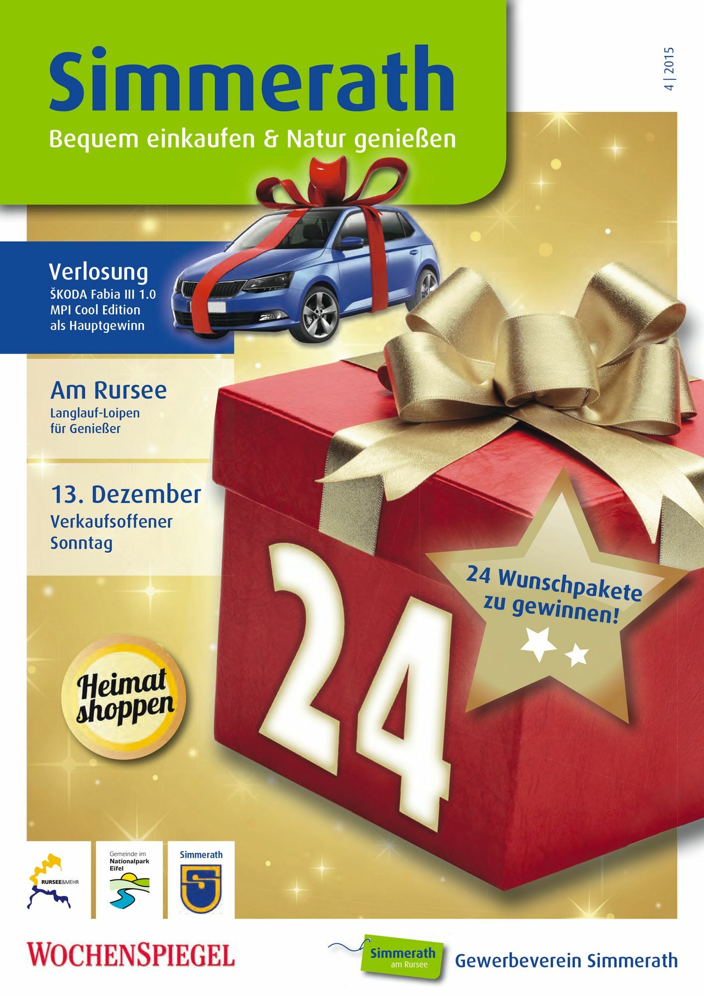 Parallel gibt der Gewerbeverein Simmerath Marketing GmbH & Co. KG gemeinsam mit dem WochenSpiegel die neueste Ausgabe des Magazins »Weihnachten in Simmerath« heraus. Dabei geht es nicht nur um die große Weihnachtsverlosung mit einem »Skoda Fabia« als Hauptpreis, sondern auch um zahlreiche Events im Advent. Zudem werden 20 Simmerather Geschenkkarten im Wert von je 50 Euro verlost. Gleich 24 neue, attraktive Gewinnchancen bieten sich den Kunden auch in so genannten Wunschpaketen, die die Simmerather Betriebe geschnürt haben. Auch Neuigkeiten aus derGeschäfts- und Vereinswelt werden behandelt.