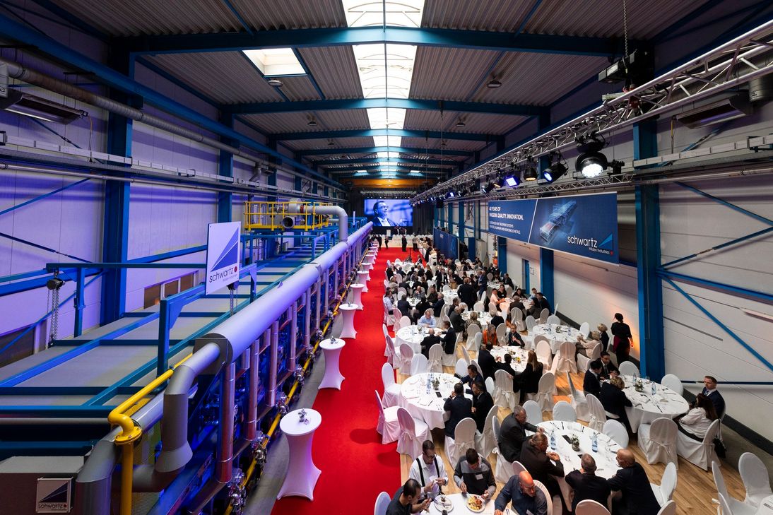 Es ist eine besondere Atmosphäre, die der 40 Meter lange Rollenherdofen ausstrahlt: Die Verbindung von Festlichkeit und industrieller Innovation ist der perfekte Rahmen für die Feierlichkeiten, die die schwartz Gruppe mit Kunden, Geschäftspartnern, Freunden, Familie und Ehrengästen, aber auch ihren Mitarbeitern zum Jubiläum beging.