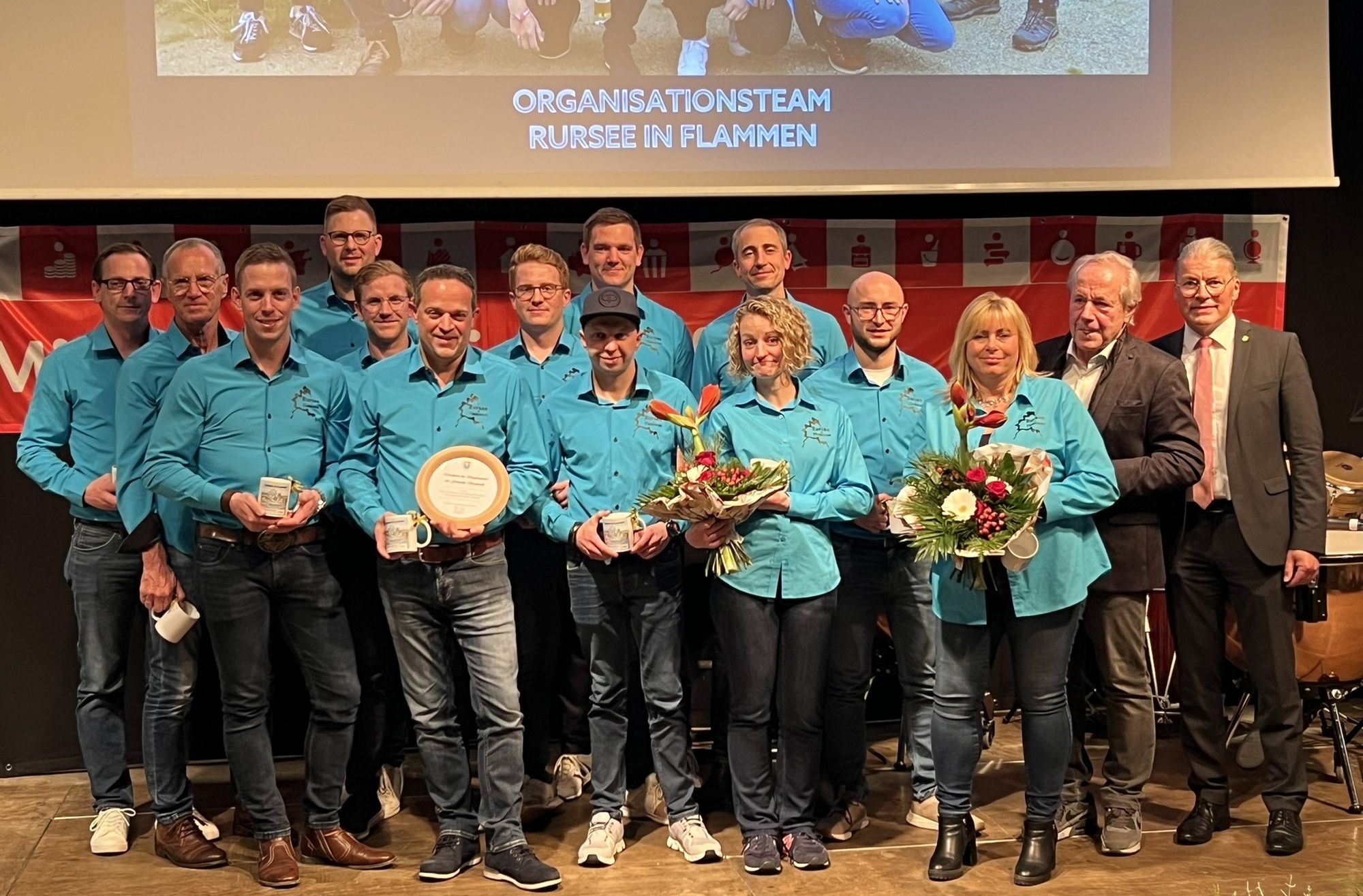 Rurberg (Fö). Es ist zweifellos das Volksfest der Region und sorgt seit fast 60 Jahren dafür, dass der Rursee nicht nur unter Wassersportfreunden und Naturliebhabern bekannt ist. Das Organisationsteam für »Rursee in Flammen« wurde nun mit dem »Bürgermeisterehrenpreis« ausgezeichnet. »Bis heute engagiert Ihr euch allesamt ehrenamtlich und schafft es, ein ganzes Dorf und noch viel mehr Freiwillige hinter euch zu versammeln«, lobt Bürgermeister Bernd Goffart den Orts- und Verkehrsverein Rurberg-Woffelsbach.