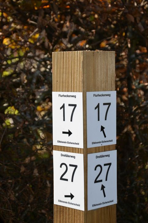 2.900 Aluschilder für Bäume und Holzpfosten, 2.500 Aufkleber für Metallpfosten und 1.000 Blankoaufkleber zur Überklebung alter Markierungen wurden auf den Wegstrecken verteilt. Die Pflege übernehmen die örtlichen Eifelverein- Ortsgruppen. »Da sind wir einmal mehr auf das Ehrenamt angewiesen«, zeigt sich Bürgermeister Hermanns dankbar. »Ruhebänke sanieren, Wege sauber halten und freischneiden, alte Flurbezeichnungen vornehmen und die Markierungen in Schuss halten - unsere Arbeiten werden immer vielfältiger«, mahnt Manfred Schreiber von der Eicherscheider Ortsgruppe.