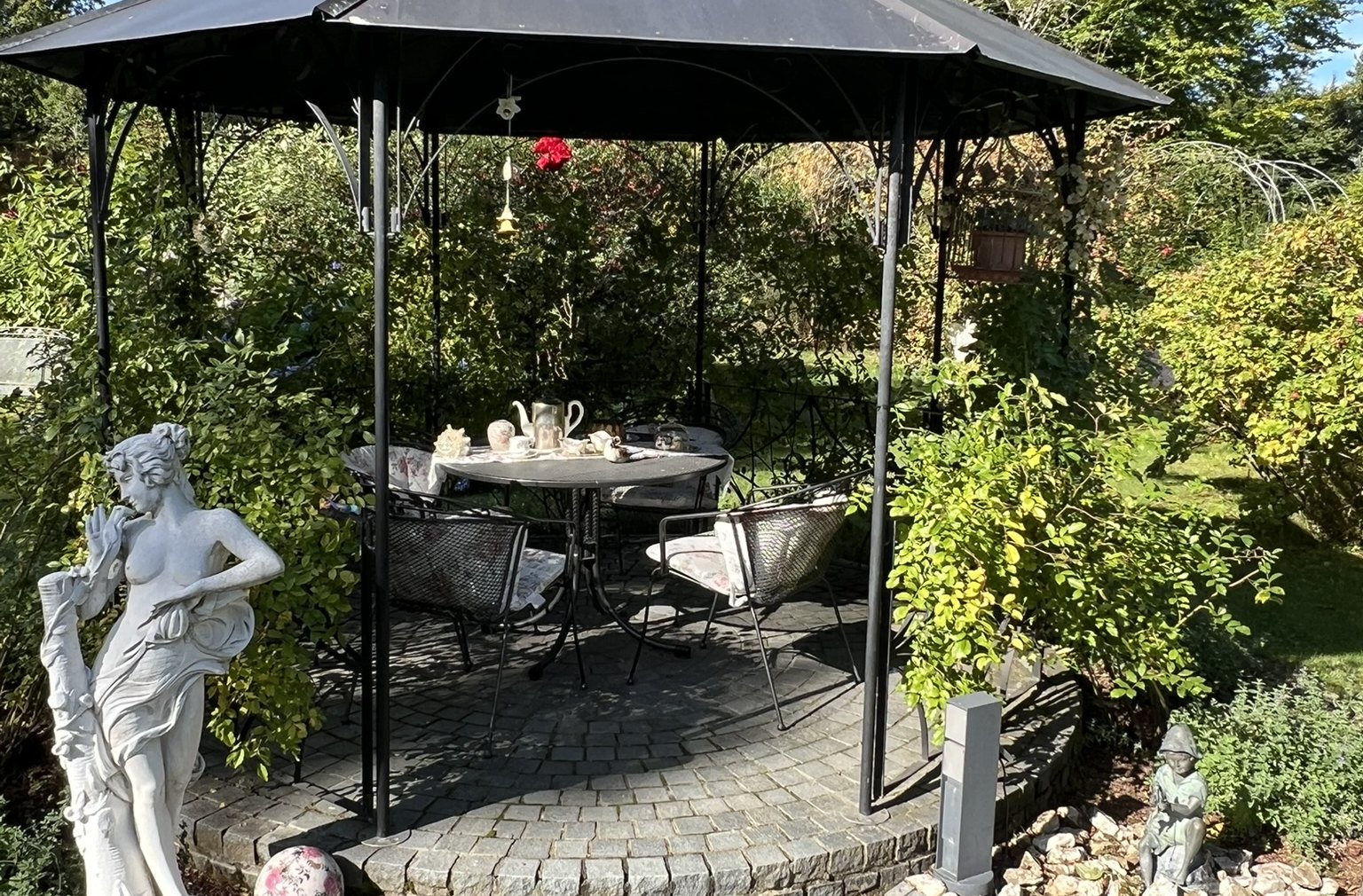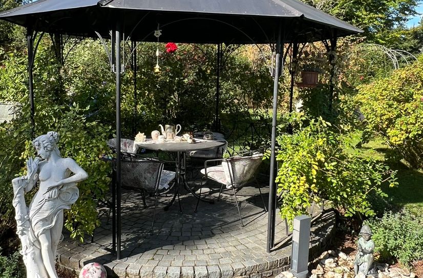 Höfen (Fö). »Meine Frau hält mich auf Trab, denn hier gibt es immer etwas zu tun«, lacht Dr. Turgut Mehmet und lässt seinen Blick von der sonnigen Terrasse über den weitläufigen Garten schweifen. Seit mehr als 35 Jahren ist dieser die Leidenschaft von Marlene Mehmet. Aus einem Meer an Beerensträuchern und Obstbäumen, Wildblumenwiese, Nutzgarten, Hochbeet, großem Teich, Kartoffelfeld und Blumenbeeten sticht eine Pflanze besonders hervor: Die Rose. 350 Blumen verschiedenster Rosenarten zieren das 6000 Quadratmeter große Areal in Höfen. »Wir legen großen Wert auf heimische Pflanzen«, unterstreicht die 74-Jährige. Auch gedüngt werde rein biologisch. Der naturnahe Landschaftsgarten ist von vielen Rotbuchen umgeben, die hoch aufgeastet wurden, um den Gartengewächsen bessere Lichtverhältnisse zu verschaffen. Auch eine Totholzhecke, Benjeshecke genannt, wurde angelegt, die vielen Tieren Unterschlupf bietet.