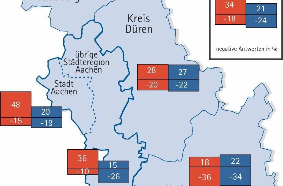 Im ehemaligen Kreis Aachen berichten etwas mehr Betriebe als zuletzt von einer guten Situation. 36 Prozent der Betriebe sind mit ihrer Lage zufrieden, 10 Prozent melden schlechte Geschäfte. Positiv gestimmt sind vor allem die Dienstleister (Saldo: +28) und die Industrie (Saldo: +22).