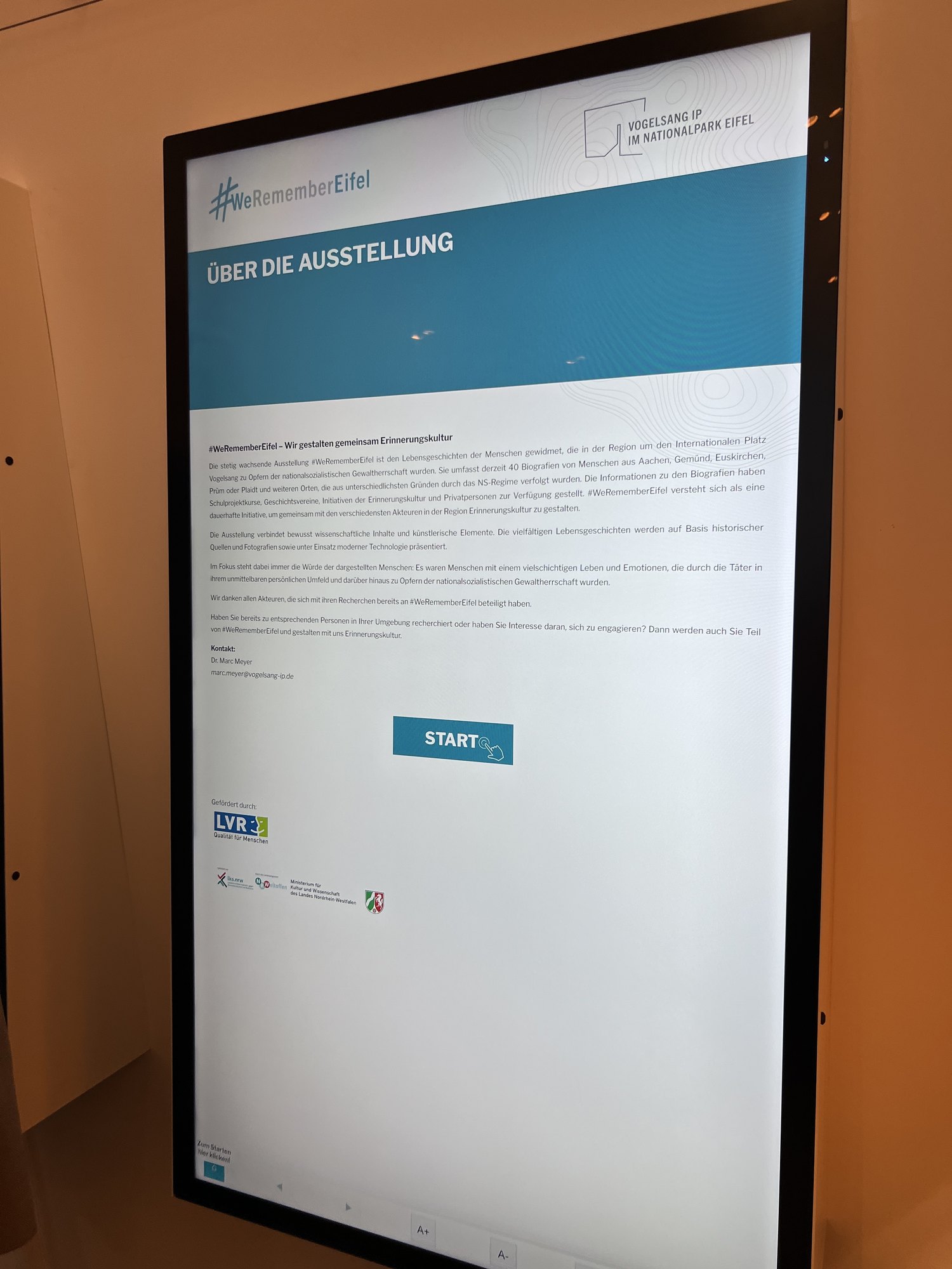 Dr. Marc Meyer, Leiter Wissenschaft und Bildung an Vogelsang IP, erläuterte das Konzept: »Wir haben uns bewusst für Mittel der Digitalisierung entschieden, um besonders auch jüngere Besucher zu erreichen.« Entstanden ist die Ausstellung in Zusammenarbeit mit lokalen Geschichtsvereinen, Heimatforschern und Initiativen wie dem Gedenkbuchprojekt Aachen um Wilma Hoekstra-von Cleef.