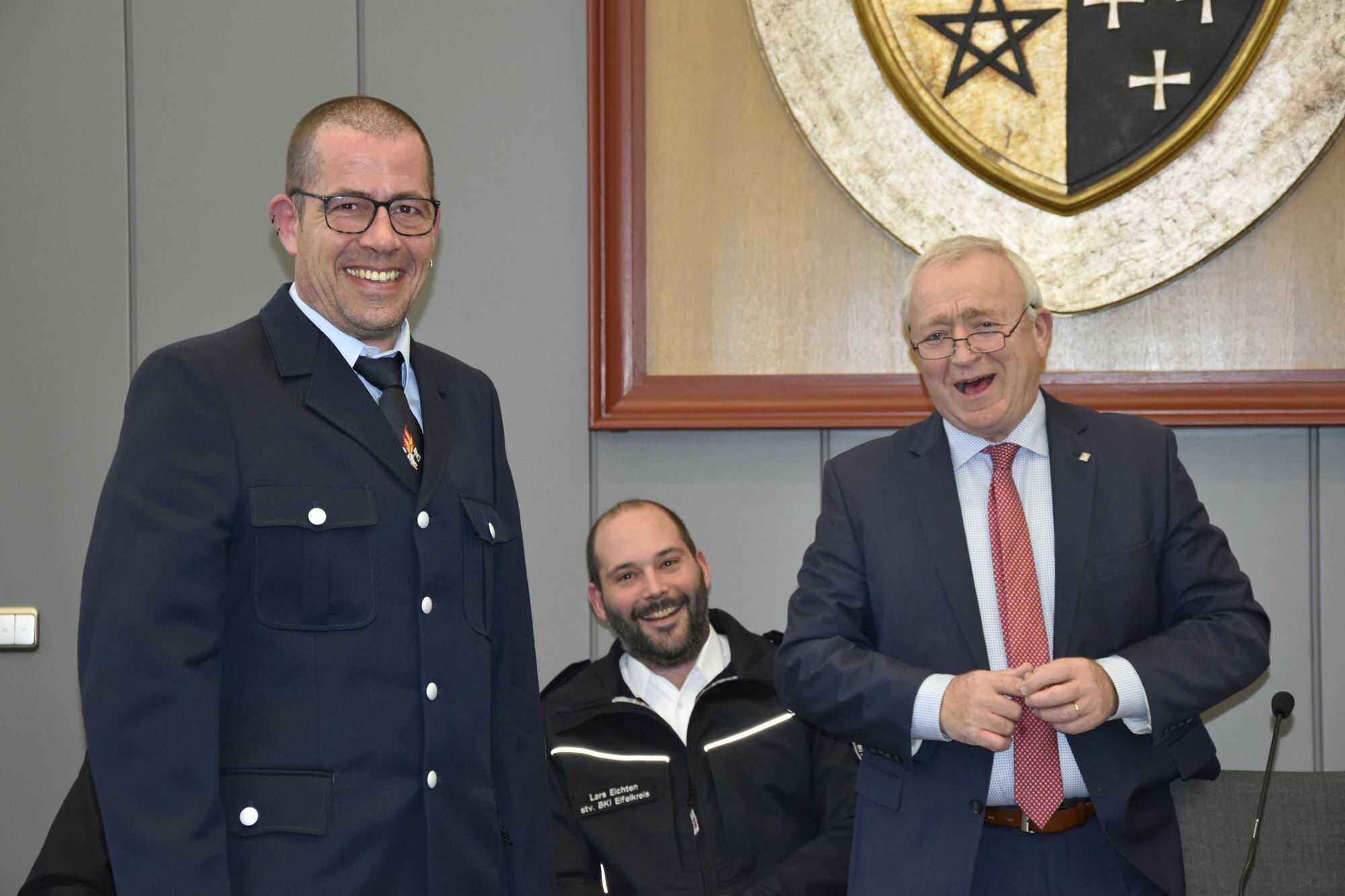 Es folgte zunächst die Beauftragung von Herrn Stefan Schweyen, der von der Freiwilligen Feuerwehr Laudesfeld einstimmig zu deren neuem Wehrführer gewählt wurde. Dann nahm Bürgermeister Söhngen im Beisein des stellv. BKI Lars Eichten, der stellv. Wehrleiter der VG Prüm, Walter Faasen und Roland Houscht, sowie des zuständigen Fachbereichsleiters Erwin Meyers und der Sachbearbeiterin Carina Krost von der VGV Prüm, 108 neue Feuerwehrkameradinnen und -kameraden per Handschlag und Unterzeichnung der Verpflichtungserklärung in die Feuerwehren der Verbandsgemeinde auf.