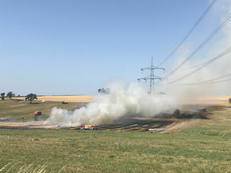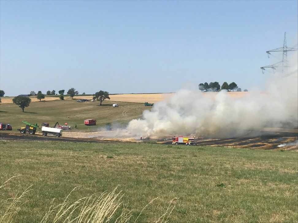 Zu einem größeren Feuer mussten am Mittwochnachmittag, 24. Juli, gegen 13.55 Uhr die Feuerwehren auf ein Feld in der Nähe der Grundschule von Rittersdorf fahren.