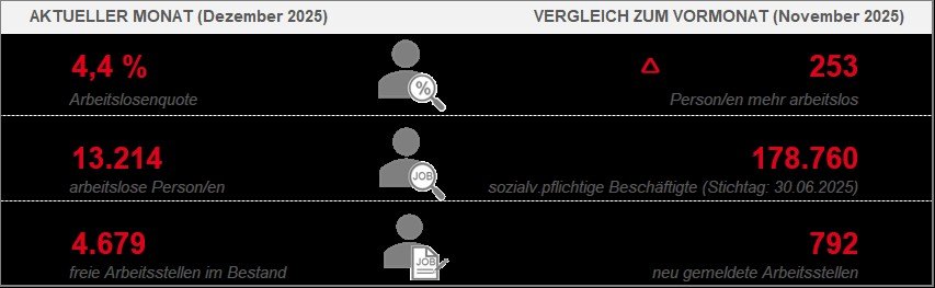 Die Unterbeschäftigung lag im Dezember nach vorläufigen Angaben bei 16.387 Personen. Sie umfasst neben den offiziell Arbeitslosen auch Menschen, die derzeit nicht als arbeitslos gelten, weil sie beispielsweise an arbeitsmarktpolitischen Maßnahmen teilnehmen. Dazu zählen unter anderem geförderte Weiterbildungen, Qualifizierungsangebote oder Programme zur beruflichen Eingliederung. Gegenüber dem Vormonat November stieg die Unterbeschäftigung um 220 Personen beziehungsweise 1,4 Prozent, im Vergleich zum Dezember 2024 sank sie um 133 Personen oder 0,8 Prozent.