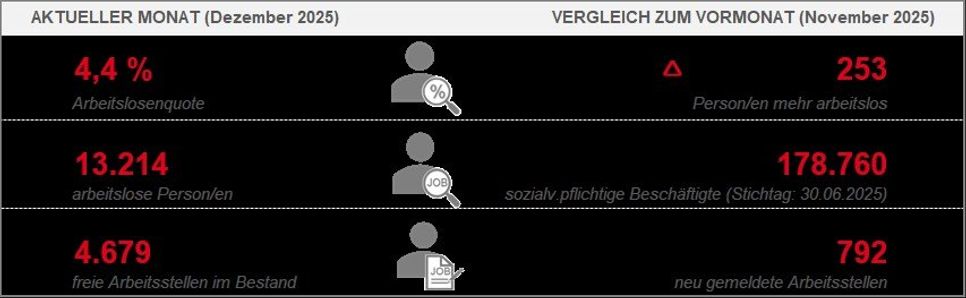 Im Dezember meldeten sich insgesamt 2.824 Personen arbeitslos, davon 1.167 direkt aus einer Erwerbstätigkeit. Gleichzeitig beendeten 2.555 Menschen ihre Arbeitslosigkeit, 729 von ihnen nahmen eine neue Beschäftigung auf.
