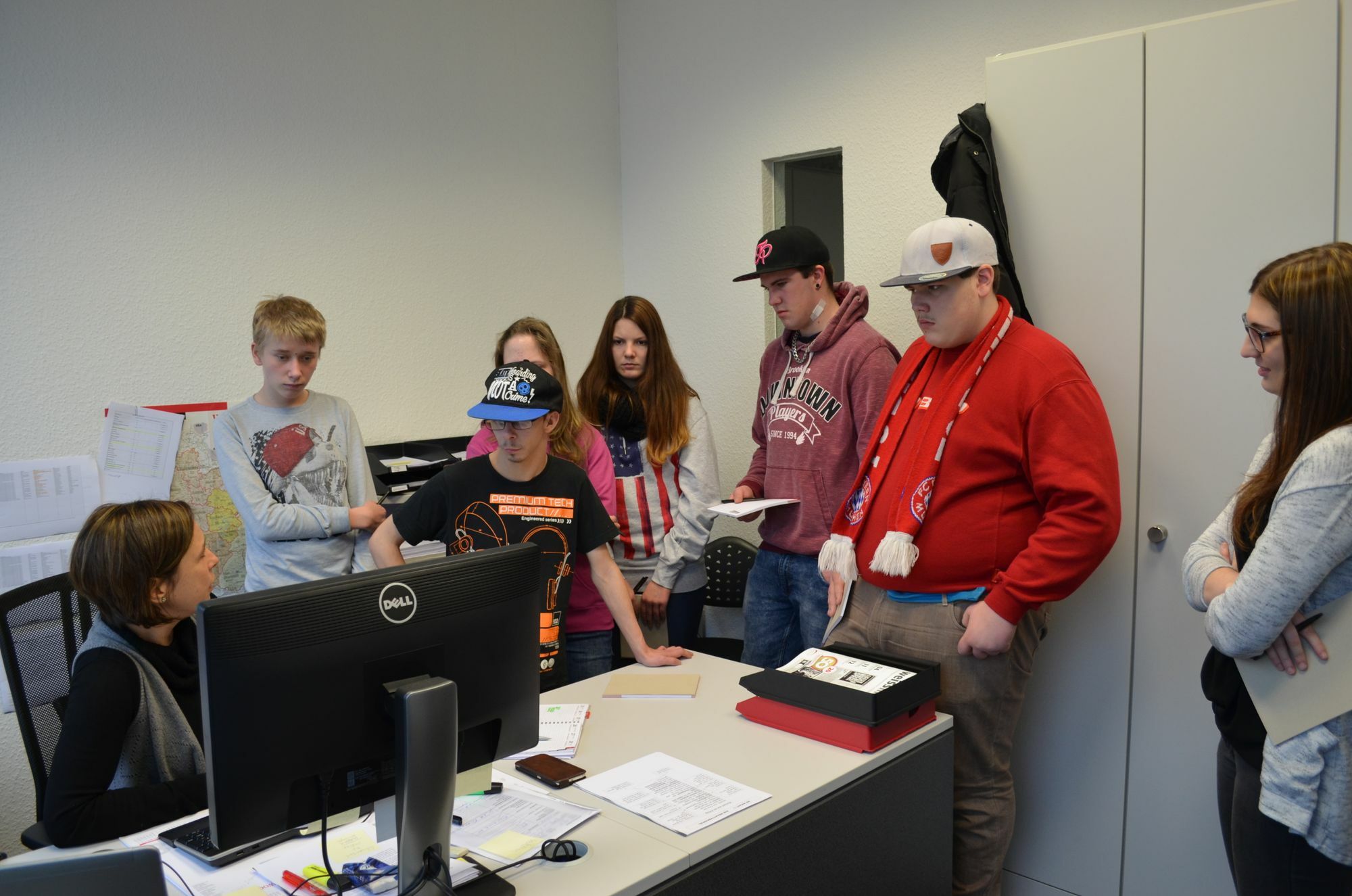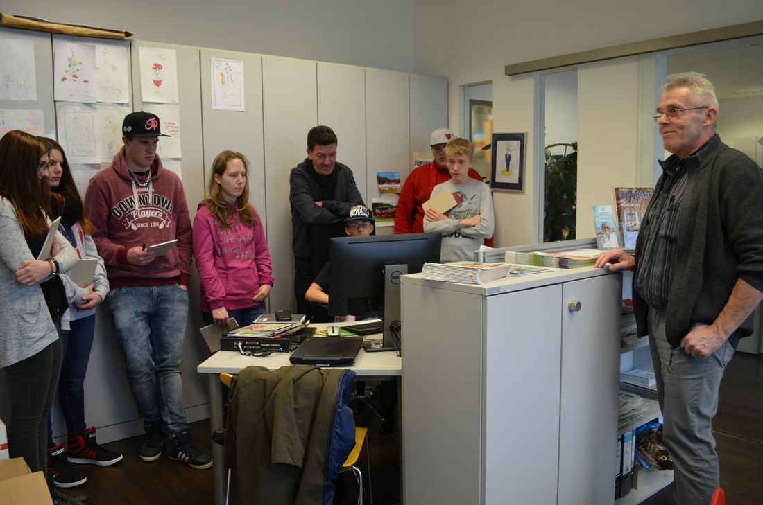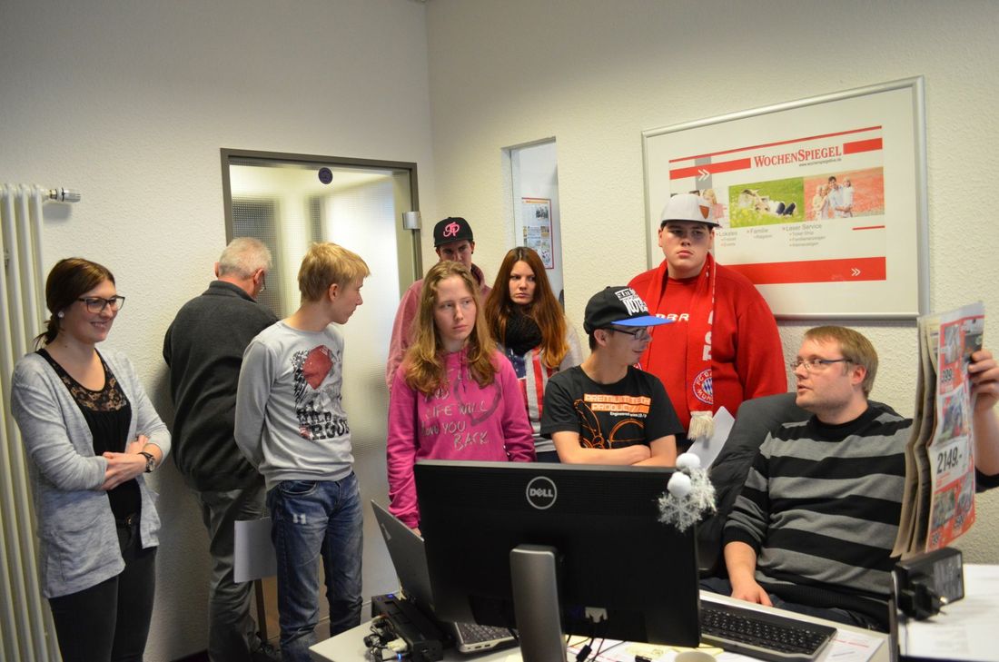 Sechs Schüler der Astrid Lindgren Schule aus Prüm und zwei Lehrer haben am Donnerstag den Wochenspiegel in Bitburg besucht. Sie wollten mehr darüber erfahren, wie man Zeitung macht, weil sie derzeit eine eigene Schülerzeitung aufbauen. Die erste Ausgabe soll im April erscheinen. "Wie macht man ein gutes Layout?", "Was kommt in eine Zeitung rein?", "Was macht ein gutes Foto aus", wollten Christian, Michelle, Tobias, Nico, Jonas und Chantal wissen. Beim Wochenspiegel machten sich die 15- bis 19-jährigen Schülerzeitungsredakteure mit einem Unternehmensfilm erstmal schlau, wie Zeitungen entstehen. Sie staunten nicht schlecht, in welch kurzer Zeit 200.000 Zeitungs- und Zeitschriftenexemplare gedruckt werden können. Sie erfuhren auch etwas über die Drucktechniken und die Geschichte des Weiss-Verlages. Anschließend schauten die Schüler Redakteurin Sybille Schönhofen über die Schulter und verfolgten live wie sie den Artikel über ihren Besuch online auf der Wochenspiegel-Homepage veröffentlichte. Redakteur Stefan Schröder zeigte ihnen dann wie man eine Titelseite des Wochenspiegels erstellt und bei Außendienst-Teamleiter Wilfried Kootz konnten sie selber Anzeigen basteln. Mediaberater Jan-Hendric Haase demonstrierte, was die crossmediale Ausrichtung des Wochenspiegels Lesern und Anzeigenkunden bietet. bil