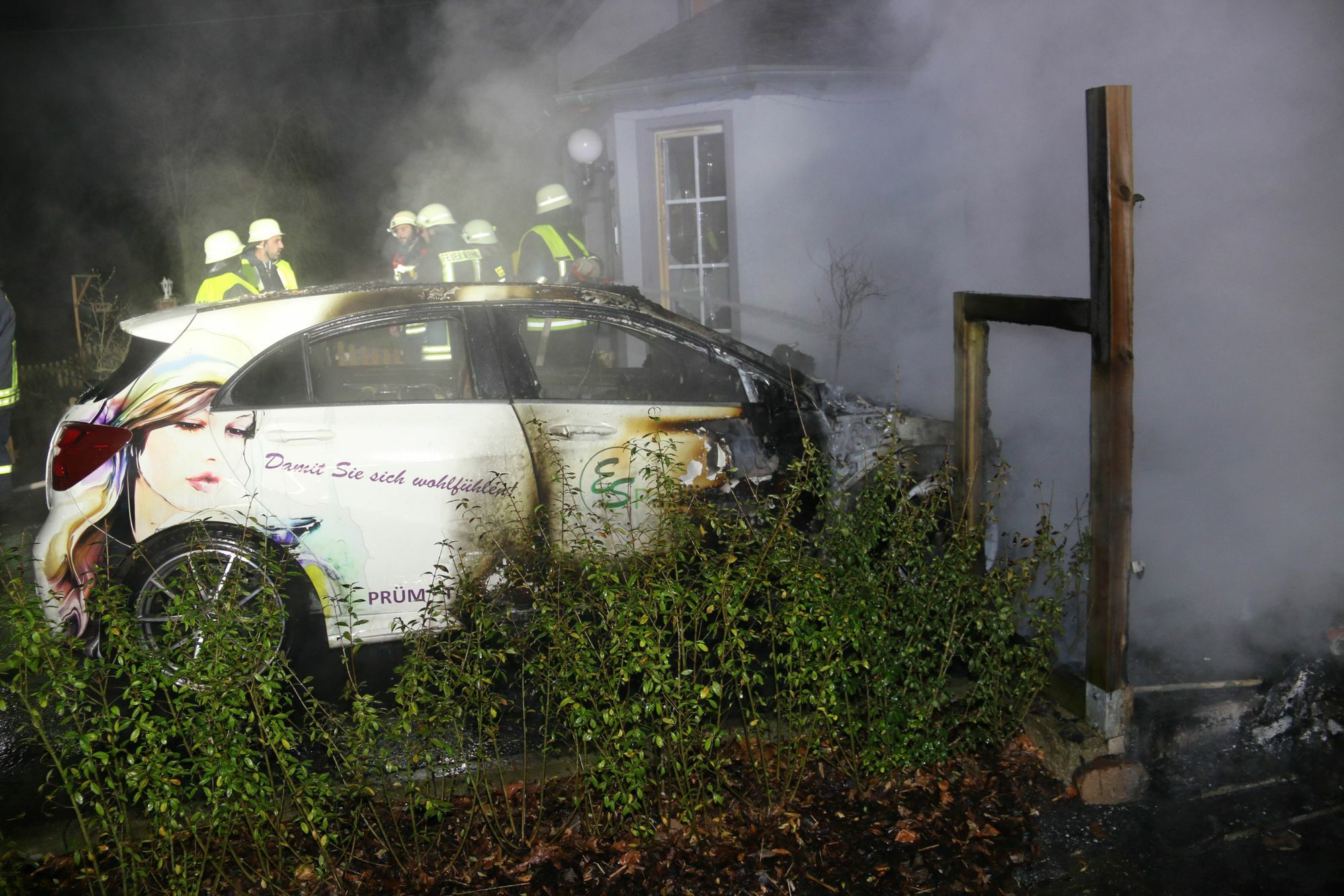 In der Neujahrsnacht kam es zum Brand eines PKW in Schlausenbach. Aus noch ungeklärter Ursache fing das Fahrzeug vermutlich im vorderen Bereich Feuer, die Feuerwehr konnte den PKW nicht mehr retten. Dieser brannte fast vollständig ab. Auch kam es zu Schäden an der Garage. Verletzt wurde niemand. Der entstandene Rauch zog auch in das angrenzende Wohnhaus. Nach Belüftung durch die Feuerwehr konnte die Familie wieder zurück in ihr Haus. Im Einsatz waren die Feuerwehren aus Prüm und Auw bei Prüm. Die Polizei hat die Ermittlungen aufgenommen.