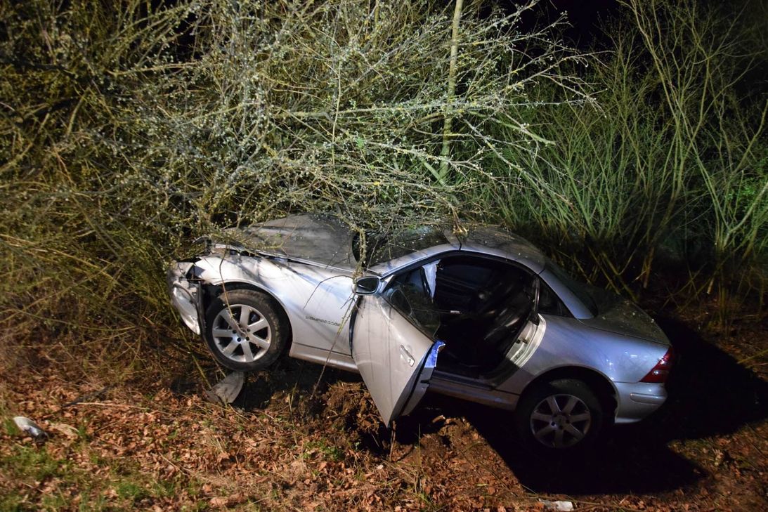 Der Fahrer eines Mercedes SLK ist am Sonntagabend auf der Kreisstraße 3 zwischen Hommerdingen und Niedersgegen schwer verunglückt. Er kam mit seinem PKW nach einer leichten Linkskurve nach rechts von der Fahrbahn ab, rutschte eine Böschung hinunter und prallte gegen einen Baum, der durch die Wucht des Aufpralls entwurzelt wurde. Andere Autofahrer entdeckten den in den Bäumen hängenden Mercedes und alarmierten die Rettungskräfte. Die Feuerwehr Körperich eilte zusammen mit dem DRK und dem Notarzt zur Unfallstelle, um den Fahrer aus dem PKW zu befreien. Zu Unfallursache und -zeitpunkt konnte die Polizei Bitburg noch keine Angaben machen, da nicht klar war, wie lange der PKW bereits in den Bäumen hing, bevor die anderen Autofahrer ihn entdeckten. Der schwer verletzte Fahrer war beim Eintreffen der Rettungskräfte nicht ansprechbar. An dem PKW entstand Totalschaden, die K3 war während den Rettungs- und Bergungsarbeiten voll gesperrt.