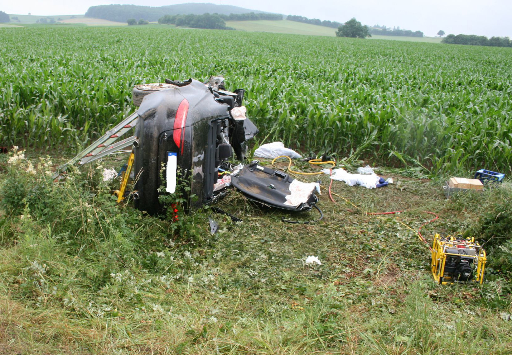 Ein folgenreicher Verkehrsunfall hat sich am Samstagmorgen um 9.20 Uhr auf der L5 (frühere B51) zwischen Schönecken und Prüm ereignet. Dabei zog sich der 27-jährige Autofahrer schwerste Verletzungen zu. Nach ersten Erkenntnissen war der Mann mit seinem PKW von Giesdorf in Richtung Rommersheim unterwegs, als er aus noch ungeklärter Ursache nach links von der Fahrbahn abkam. Der Wagen streifte einen Baum, überschlug sich und blieb in einem Maisfeld liegen. Der schwer verletzte Fahrer wurde mit dem Rettungshubschrauber Christoph 10 in ein Krankenhaus geflogen. Neben der Polizei Prüm waren die Feuerwehren aus Rommersheim, Ellwerath und Prüm sowie Notarzt und Rettungswagen aus Prüm im Einsatz. Foto: Siko