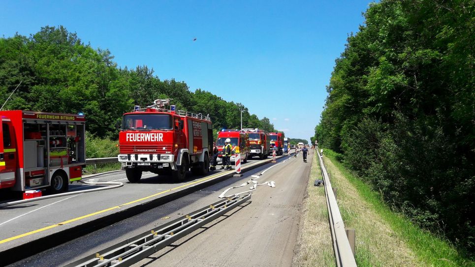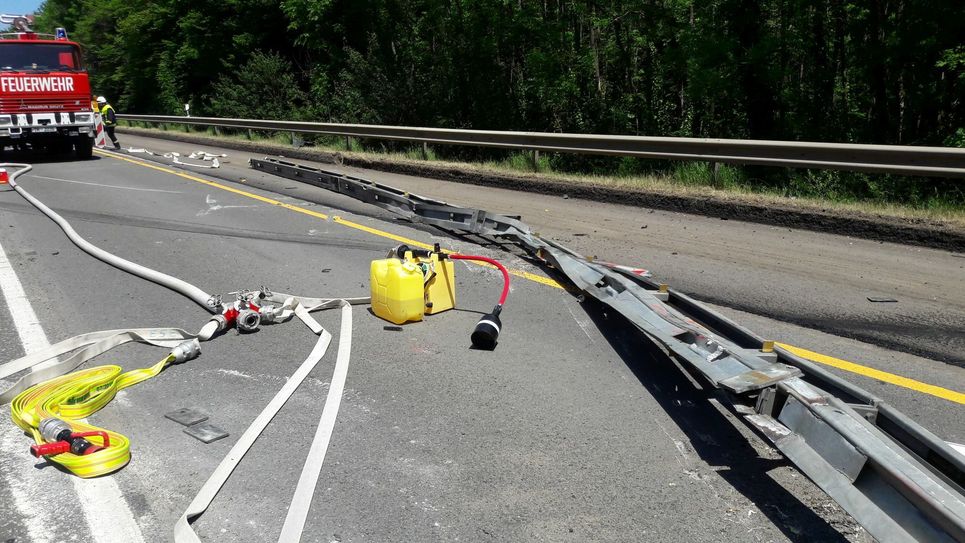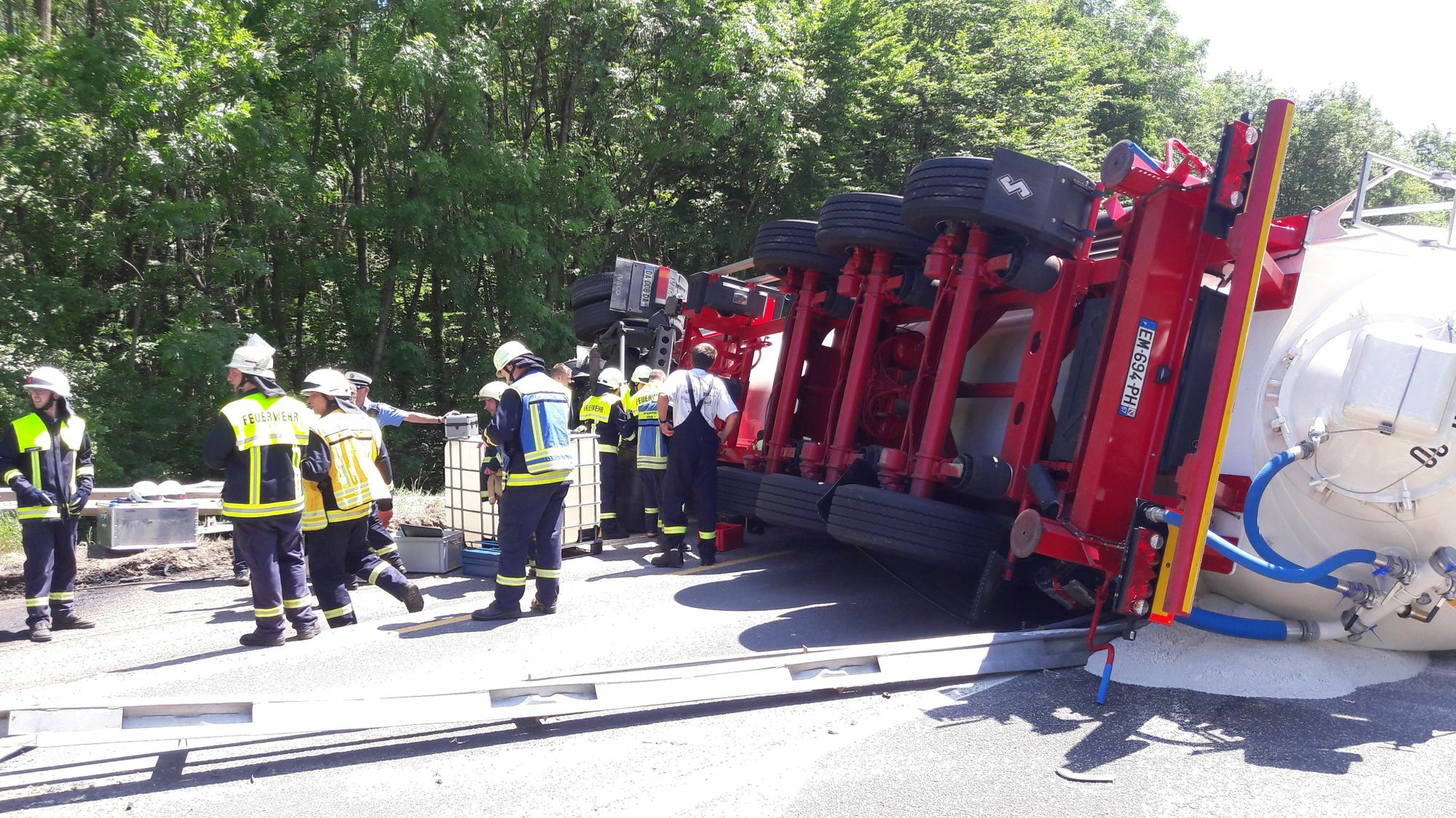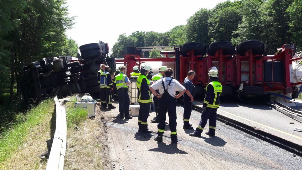 Der Sattelzug kippte um und blieb auf Fahrbahn liegen. Der LKW-Fahrer blieb unverletzt. Erschwert wird die Situation vor Ort dadurch, dass dieser Streckenabschnitt derzeit wegen einer Baustelle ohnehin eingeengt ist. Die B 51 ist bis auf Weiteres in beide Richtungen gesperrt. Eine großräumige Umleitung ist eingerichtet. Derzeit wird die Ladung auf ein anderes Fahrzeug umgeladen. Erst dann kann die Bergung des verunglückten Sattelzuges erfolgen. Wie lange diese Arbeiten andauern werden, ist zum jetzigen Zeitpunkt noch nicht absehbar. Im Bereich der Unfallstelle befinden sich noch Fahrzeuge, die aufgrund der derzeitigen Baustellensituation dort nicht wenden können. Die Insassen müssen zunächst vor Ort ausharren und werden aufgrund der sommerlichen Temperaturen durch das DRK versorgt. Fotos: Siko
