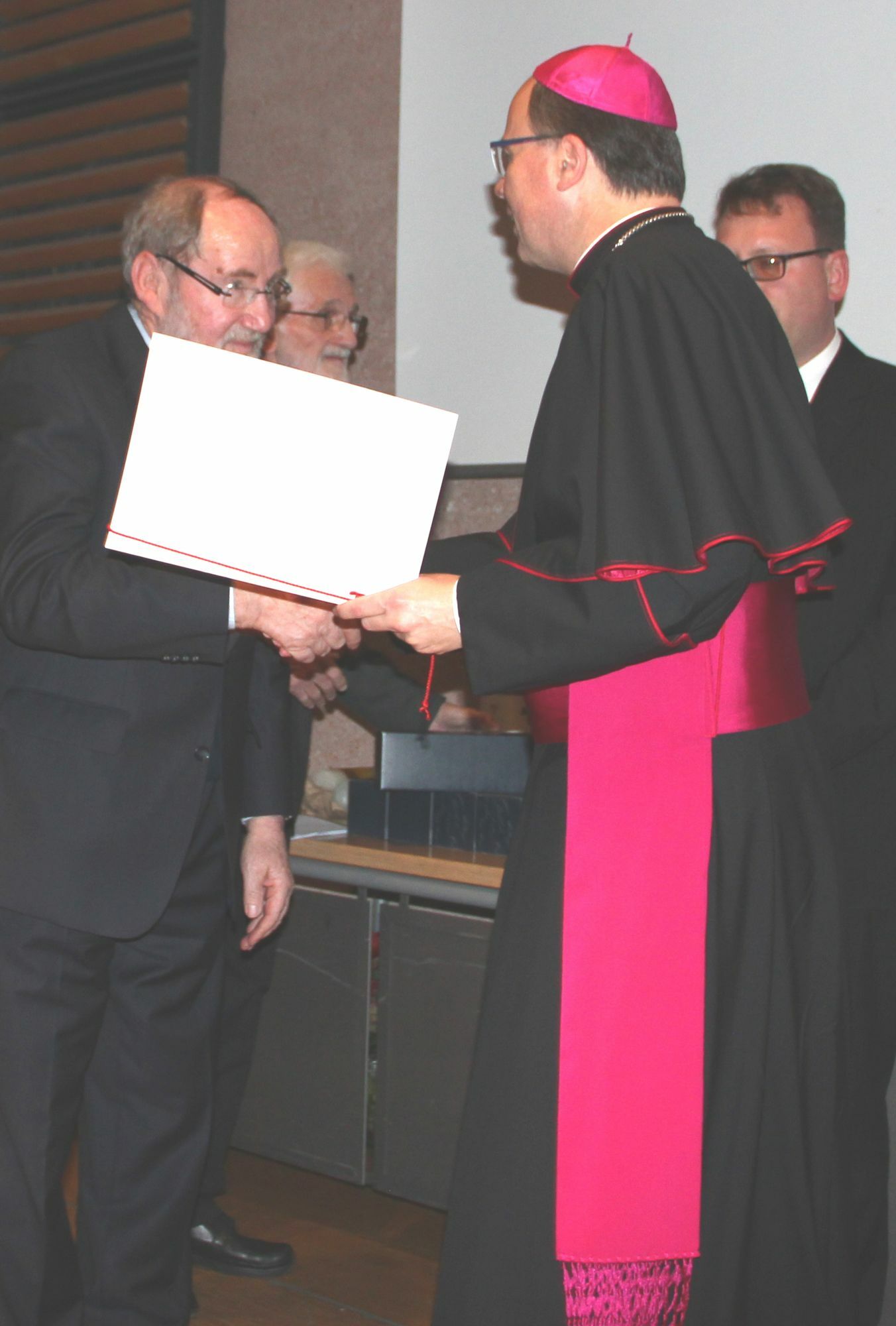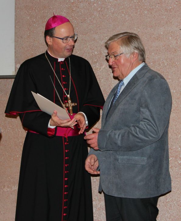 Klaus Balmes hat sich 40 Jahre im Pfarrgemeinderat Ammeldingen engagiert, davon 36 Jahre als Vorsitzender. Er ist Lektor und Kommunionhelfer, kümmerte sich um die Organisation der Feste im Kirchenjahr, und hat den Besuchsdienst der Pfarrei ins Leben gerufen. Balmes ist auch ehrenamtlich engagiert in der Fortbildung von Religionslehrerinnen und -lehrern. Werner Lehnen war 42 Jahre Mitglied im Pfarrgemeinderat Karlshausen, ist engagiert im Bereich der Wortgottesfeiern und der Organisation von Sternsingeraktionen, Krippenspielen oder Pfarrfesten. Er ist Lektor und arbeitet auch im karitativen Bereich ehrenamtlich mit sowie bei der Erwachsenenbildung. Ausgezeichnet wurden auch Dieter Dieler (PG Boppard), Markus Koch (PG Rheinböllen), Günther Rehles (PG Rupertsberg), Konrad Schmidt (PG Mülheim-Kärlich), Hiltrud Surges (PG Mendig), Johannes Tempel (PG Adenauer Land) und Heinrich Wollscheid (PG Weiskirchen). Mit der Bürgerhilfe Neumagen-Dhron, der sozialräumlichen Pastoralarbeit in der Pfarrei St. Franziskus Koblenz-Goldgrube und dem KirchenCafé Sinzig wurden auch drei Projekte geehrt. Michaela Tholl, Leiterin des Arbeitsbereichs Ehrenamtsentwicklung im Bischöflichen Generalvikariat Trier, würdigte die Ehrenamtlichen: "Menschen wie Sie sind ein wichtiger Teil unserer Kirche. Ohne Sie wäre sie ärmer an Nächstenliebe, Begeisterung und Überzeugungskraft." Die ausgezeichneten Frauen und Männer stünden stellvertretend für rund 80.000 ehrenamtlich Engagierte im Bistum. Mit Blick auf die Umsetzung der Synodenergebnisse sagte Tholl, die Kirche werde ihr Gesicht verändern, werde individueller und vielgestaltiger. Deshalb komme es auf jede und jeden an, das Leben als Christin und Christ zu gestalten. Bischof Ackermann dankte dem Arbeitsbereich für die Ausrichtung des Festakts, der schon zur "guten Tradition" werde. Die Wertschätzung des Engagements sei wichtig, deshalb wolle das Bistum "bewusst und festlich Danke sagen". In seiner Ansprache bei der abschließenden Gebetszeit sagte Ackermann, das Motiv der Gastfreundschaft -"das heißt Offenheit und Zuwendung zu anderen" - habe den Festakt geprägt. "Das Wort von der offenen und gastfreundlichen Kirche ist uns ins Stammbuch geschrieben. Wir durften heute erleben, wie das verwirklicht wird." Gastfreundschaft sei ein Eingangstor für Menschlichkeit. Diese Haltung setze Neugierde auf andere Menschen voraus und "keine Angst zu haben, wenn uns Fremdes begegnet". Dies sei möglich, je stärker man sich im Glauben verwurzelt wisse, das gebe Identität. "Gott im Rücken und die Gemeinschaft um uns herum sollen uns stärken - aber nicht um uns abzuschotten, sondern um die Kraft zu haben, offen zu bleiben." Ackermann sagte, er sei dankbar für die wunderbaren Beispiele der Menschen, die den Mut hätten, Neues zu wagen, zu experimentieren und aufbruchsbereit zu bleiben. Heike Bros, Helmut Recktenwald und Monika Seidel von der Kommission, die über die Ehrungen entscheiden, und Georg Hennes vom Arbeitsbereich Ehrenamtsentwicklung stellten die Geehrten und die Projekte vor. Alle Geehrten sind teils seit Jahrzehnten Mitglieder in den Räten oder engagieren sich in einem speziellen Bereich wie der Jugend- und Messdienerarbeit, der Organisation von Festen im Kirchenjahr oder bei der Pflege von Kirchen und Kapellen. Den drei Projekten ist das Motiv der Gastfreundschaft gemein. Festakt und Gebetszeit wurden musikalisch begleitet vom Kirchenchor St. Georg Trier-Irsch unter der Leitung von Bernhard Schleimer und Pianist Klaus-Peter Bungert. Weitere Informationen rund um den Arbeitsbereich Ehrenamtsentwicklung sind unter www.ehrenamt.bistum-trier.de zu finden. Fotos: Bistum