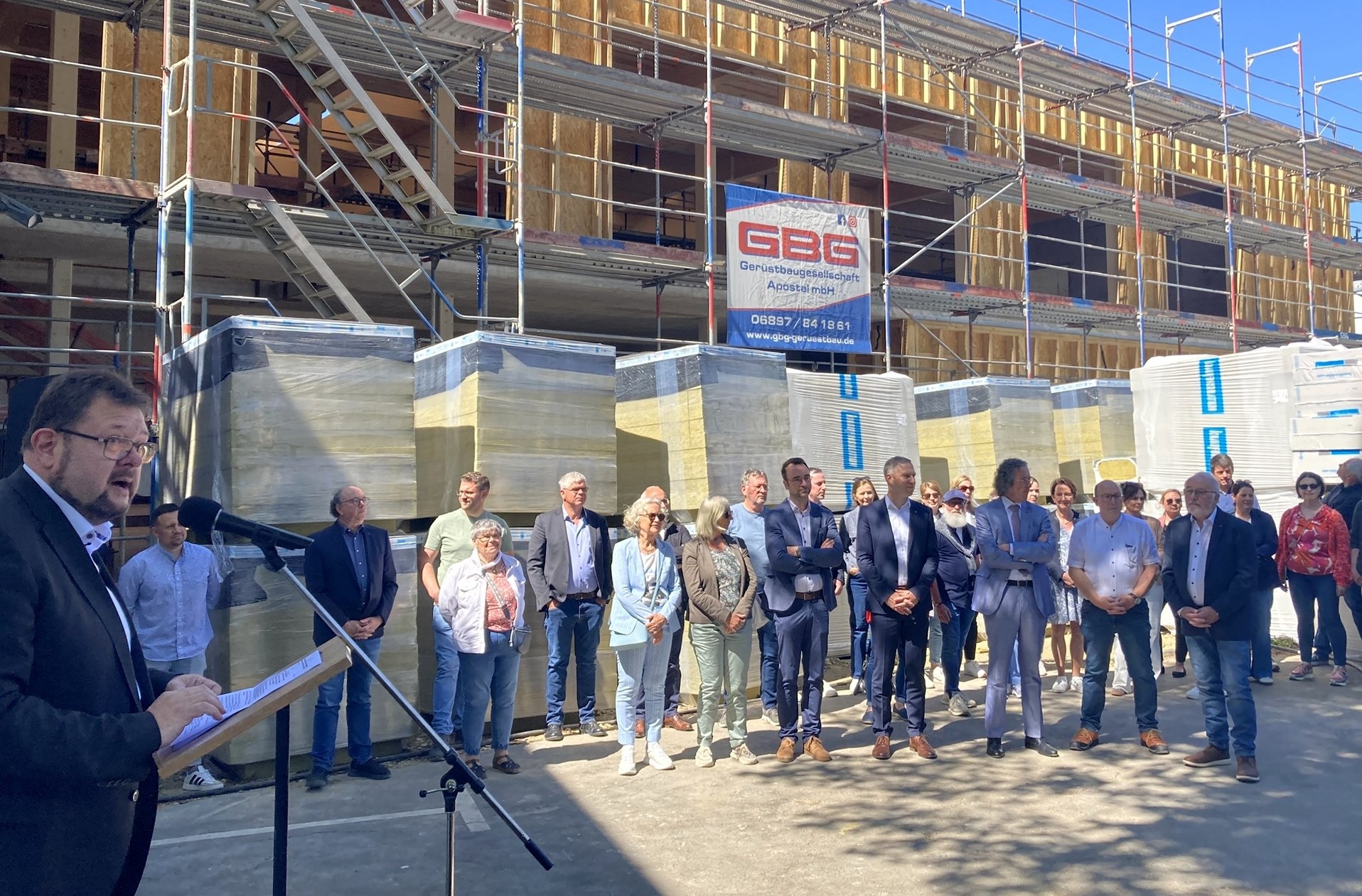 Zimmermann Christoph Rascopp verlas im Rahmen der traditionellen Zeremonie den Richtspruch. Peter Hardt vom Planungsbüro Hardt und Partner hob die gute Kooperation mit der städtischen Bauverwaltung hervor.