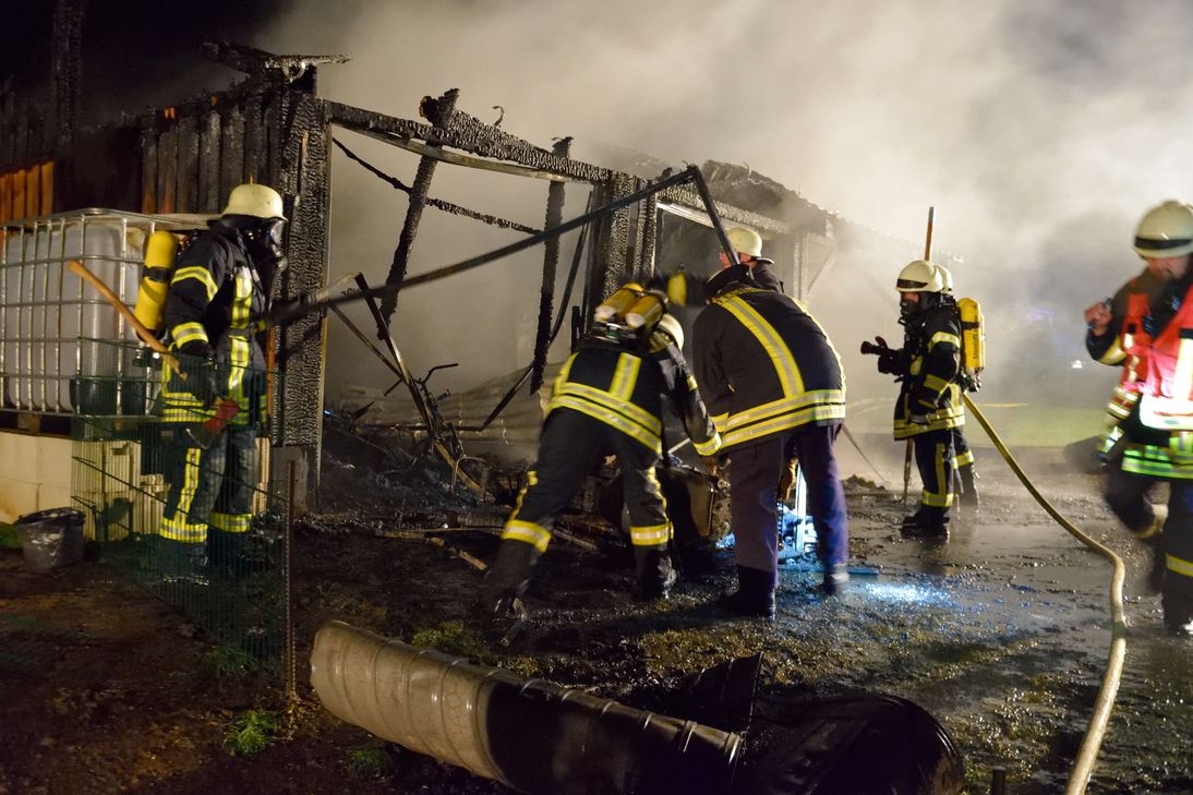 Am Dienstagabend ist gegen 23.30 Uhr ein Geräteschuppen in Hommerdingen abgebrannt. Insgesamt 56 Wehrkräfte der Feuerwehren aus Hommerdingen, Nusbaum, Körperich, Kruchten, Mettendorf und Neuerburg rückten zur Einsatzstelle aus. In dem Schuppen befanden sich mehrere Gerätschaften, darunter auch ein Motorrad, das durch den Brand total zerstört wurde. Die Schadenshöhe und Brandursache waren bis zum Redaktionsschluss noch unklar. Im Einsatz waren neben der Feuerwehr die Polizei Bitburg und das DRK. Foto: Siko