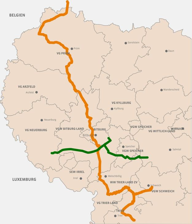 Wenn wie geplant diese Woche das Baurecht vorliegt, werden die Arbeiten für die Pipeline ausgeschrieben. Anfang Januar können die ersten Aufträge vergeben werden. Dann beginnen die Rodungsarbeiten für die Trasse, die auf 80 Kilometern durch Wälder, Felder und über Wiesen verlaufen wird. Zusätzlich zu der Verbundnetztrasse, die von Nord nach Süd verläuft, soll von Westen nach Osten eine Biogastrasse (grüne Linie in der Grafik zum Trassenverlauf) entstehen. In ihr wird das Gas aus regionalen Biogasanlagen transportiert, um aufbereitet und letztlich der Nord-Süd-Pipeline zugeführt zu werden. Aber von vorn: 2014 begann ein wegweisendes Infrastrukturprogramm in Prüm - das Projekt "Regionales Verbundsystem Westeifel". Es ist bundesweit einmalig. Hier geht es darum, die Region mit Trinkwasser, Energie und Telekommunikation zu versorgen und dabei gleichzeitig einen Beitrag zur Energiewende zu leisten. Geplant ist die Einbindung regionaler, regenerativer Erzeugungsanlagen in den Bereichen Wind, Sonne, Gas und Wasser. Planer des Projektes ist die Kommunale Netze Eifel AöR (KNE) aus Prüm. Kernstück des Verbundsystems ist der Bau einer Leitungstrasse für eine Trinkwasserleitung, Stromkabel, Bio- und Erdgasleitungen und auch für die Breitbandnutzung. Die Trasse soll von der Oleftalsperre bis nach Trier verlaufen. 250.000 Menschen werden über sie versorgt. Ziel ist folgende Vision, wie sie Umweltstaatssekretär Thomas Griese für den Zeitpunkt der Fertigstellung formulierte: Die Trinkwasserversorgung in der Region werde dann gesichert sein. Kommunen und Industrie würden ihre Energie weitgehend aus erneuerbaren, regionalen Quellen beziehen. Die von der Landwirtschaft erzeugte Bioenergie werde die wetterbedingten Schwankungen der Wind- und Solarenergie ausgleichen. Und ein modernes Breitbandnetz werde die Voraussetzung für hochwertige Arbeitsplätze schaffen. 27.000 Haushalte in der Eifel profitieren künftig von den in der Trasse verlegten Glasfaserkabeln.