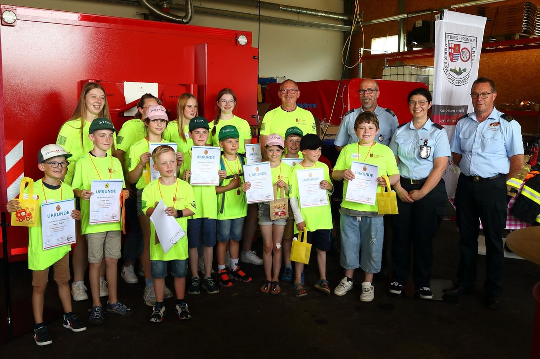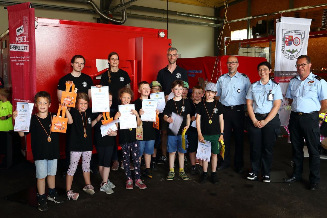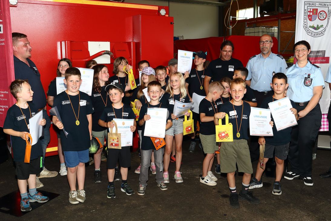 Rund 52 junge Teilnehmerinnen und Teilnehmer aus Prüm, Sülm, Biersdorf am See und Mettendorf zeigten ihre Fähigkeiten in verschiedenen feuerwehrtechnischen Aufgaben. An acht Stationen mussten die Kinder Aufgaben wie das Absetzen eines Notrufs, das Anlegen eines Fingerkuppen-Verbands und das richtige Verhalten im Brandfall bewältigen. Diese Aufgaben wurden durch fachkundiges Personal in zwei Stufen bewertet. Unterstützt wurde die praktische Prüfung durch die Feuerwehr Sülm. Die Drohnen-Staffel des Katastrophenschutzes zeigte vor dem offiziellen Teil ihre Fähigkeiten und informierte über ihre Arbeit.