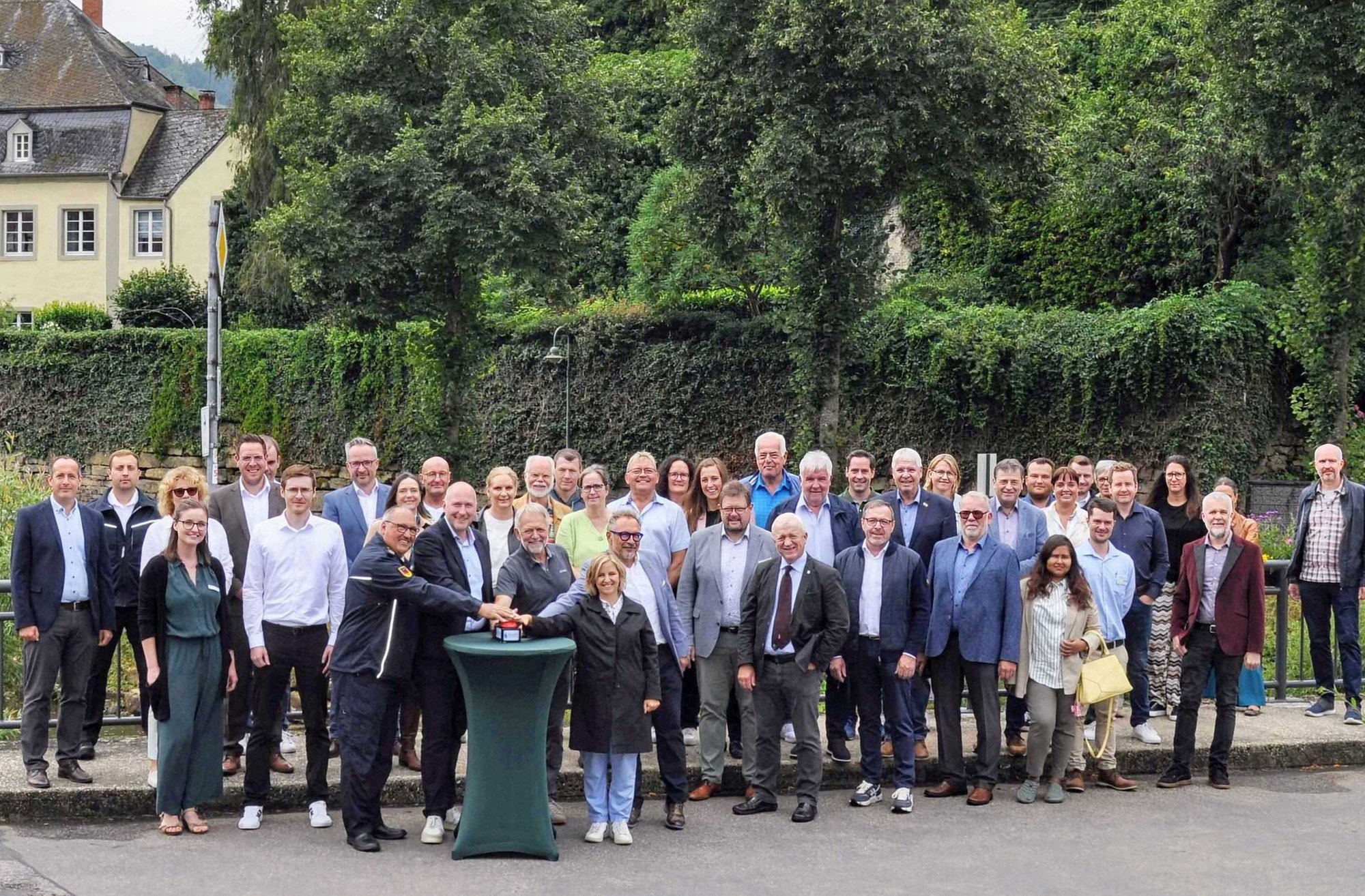 Zahlreiche Gäste nahmen an der symbolischen Inbetriebnahme auf der Prümbrücke in Holsthum teil, darunter Ortsbürgermeister Klaus Reschke, der Erste Kreisbeigeordnete Michael Ludwig (MdL), Vertreter der Kreisverwaltung sowie Mitglieder des Bevölkerungsschutzes.