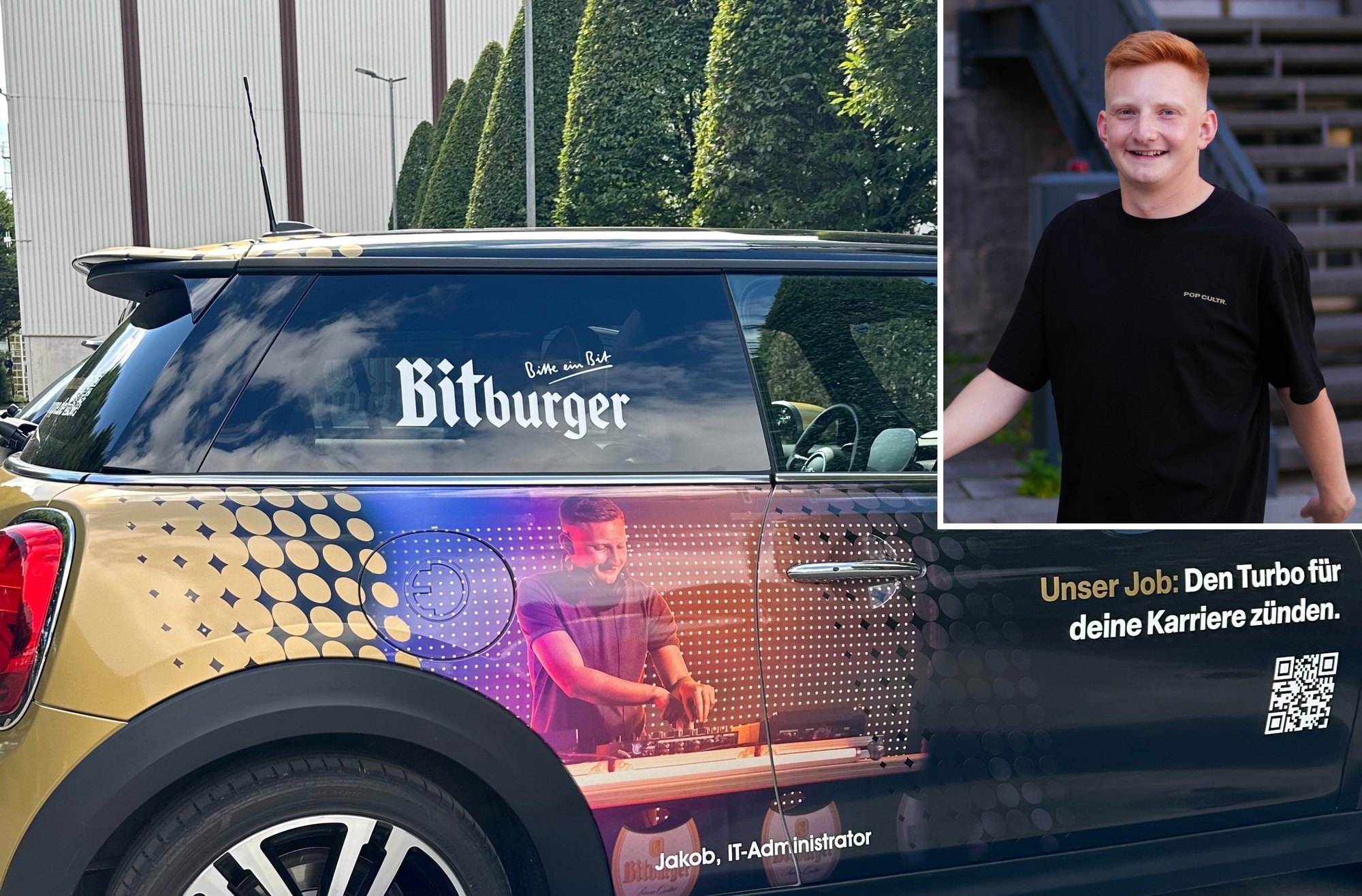 Unter der Woche arbeitet Jakob im IT-Support der Bitburger Braugruppe. Bekannt ist er dort nicht nur als Kollege, sondern auch als Gesicht einer Personalkampagne für Auszubildende. "Irgendwann hieß es: Wir haben doch einen DJ bei uns – warum nutzen wir das nicht?", erinnert er sich. So entstand das Karrierevideo mit dem Slogan "Ich mische zwar kein Hopfen und Malz, aber Beats und Bits." Seitdem rollen drei Bitburger-Autos mit seinem Bild über die Straßen der Region – eine Aktion, die ihm bis heute Schmunzler beschert. "Es ist schon lustig, wenn mir Freunde ein Foto schicken und sagen: Du bist mir gerade auf der B51 entgegengekommen", erzählt er lachend.