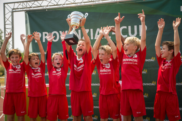 Auf der Sportanlage des FC Bitburg fand am vergangenen Samstag der Provinzial Eifel Cup 2018 statt. Das Wetter und die Spieler zeigten sich dabei von iIhrer besten Seite. Nach der Begrüßung auf der Provinzial Bühne starteten die U11 und U13 Turniere mit jeweils 4 und 11 Mannschaften auf vier Spielfeldern. Auf zwei frisch hergerichteten Rasenplätzen und einem tollen Kunstrasenplatz kämpften die Teams in den Gruppen um den Einzug ins Viertel- bzw. Halbfinale. Dabei kristallisierten sich schnell die Favoriten heraus: In der U11 gingen die JSG Prümer Land vor dem FC Bitburg 1 als Tabellenführer durch die Gruppenphase. Die Plätze drei und vier belegten der FC Bitburg 2 und der SV Trier-Irsch. In tollen Halbfinalspielen sicherten sich der FC Bitburg 1 und die JSG Prümer Land das Finalticket. Das Finale gewann der Gastgeber FC Bitburg dann deutlich mit 6:0. In der U13 wurde in drei Gruppen mit je 4, 4 und 3 Mannschaften gespielt und die ersten beiden Teams sowie die besten Dritten jeder Gruppe spielten noch eine Finalrunde. Im Viertelfinale setzten sich die JSG Bitburger Land, die JSG Mehring, die JSG Vulkaneifel und der JFV Wittlicher Tal durch. Die JSG Bitburger Land überraschte im Viertelfinale mit einem knappen 1:0 Sieg gegen TuS Koblenz. Die Halbfinalpartien waren lange spannend. Die JSG Bitburger Land setzte sich im Neunmeterschießen mit 4:3 gegen die JSG Mehring durch und ließ die heimischen Fans jubeln. Als zweites zog parallel der JFV Wittlicher Tal ins Finale ein. Im Finale kam es dann zum großen Coup. Die JSG Bitburger Land gewann das Finale bravourös mit 4:3 nach Neunmeterschießen. Der Heimatverein stellte damit die Sieger in beiden Turnieren. Die Siegermannschaften freuten sich über einen großen Pokal und feierten dies anschließend ausgiebig auf der Bühne. Spaß gab es auch neben dem Rasen: An der Torwand konnten die kleinen und großen Kicker ihre Schussgenauigkeit zeigen, in einem Dribbelparcours mit elekronischer Zeitmessung stellten sie ihre Ballbehandlung unter Beweis und die Schussgeschwindigkeitsmessung regte besonders zum Wettbewerb mit den Teamkollegen an. An der Tombola versuchte jeder den Hauptpreis, ein originales Deutschlandtrikot zu gewinnen.Die Einnahmen der Tombola werden zu 100 Prozent an die Jugendabteilung des FC Bitburg gespendet.