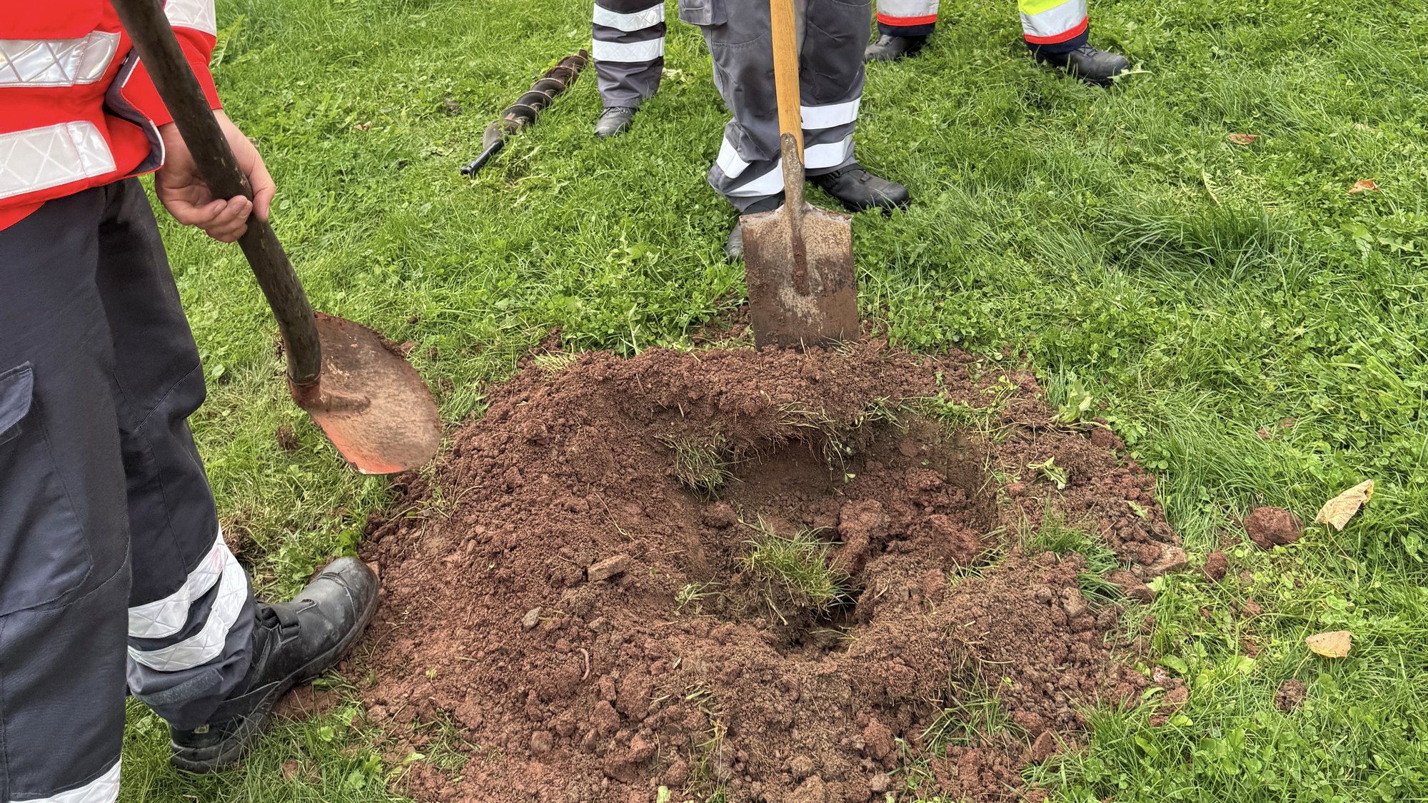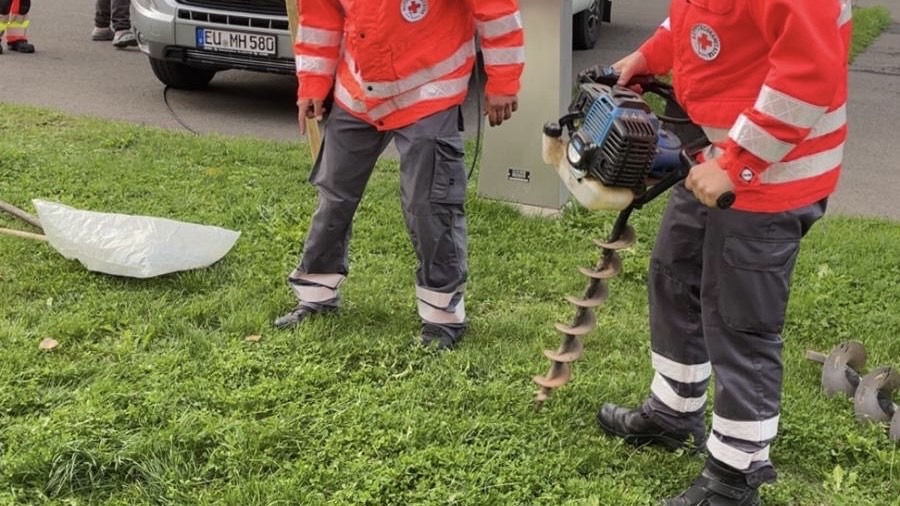 Die Baumpflanzaktion in Prüm hatte eine besondere Note: Die Mitglieder fuhren mit dem Rettungswagen los, holten den Baum symbolisch „wie einen Patienten“ ab und transportierten ihn zur Einpflanzstelle. In einem Video steht ein DRK-Helfer an einem bereits von der Feuerwehr Prüm gesetzten Baum und meldet per Funk, dieser „einsame, verlassene Baum“ benötige Betreuung. Kurz darauf treffen weitere Mitglieder ein, entzünden den Grill und stärken sich, bevor die Arbeit beginnt.Mit einem speziellen Bohrer wurden die ersten Löcher in das Erdreich gebohrt und mit der Schaufel vergrößert, bis genügend Platz geschaffen war. Anschließend setzten die Helfer den Baum in das vorbereitete Loch, füllten es sorgfältig mit Erde auf und befestigten ihn.