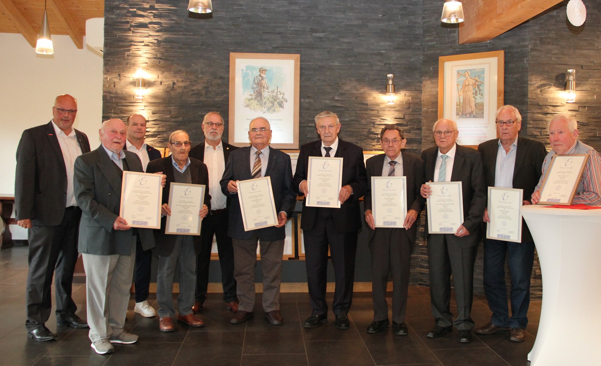 Die Ehrenurkunde für 60 Jahre Meisterwürde erhielten: Fleischermeister Adolf Schmitz, Gerolstein; Gas- und Wasserinstallateurmeister Manfred Wagner, Üdersdorf; Kraftfahrzeugmechanikermeister Josef Jung, Oberkail; Maurermeister Klaus Follmann, Hillesheim; Schlossermeister Rainer Bohlen, Speicher; Tischlermeister Josef Hoffmann, Bettingen; Zimmerer und Treppenbauermeister Winfried Müller, Kyllburg