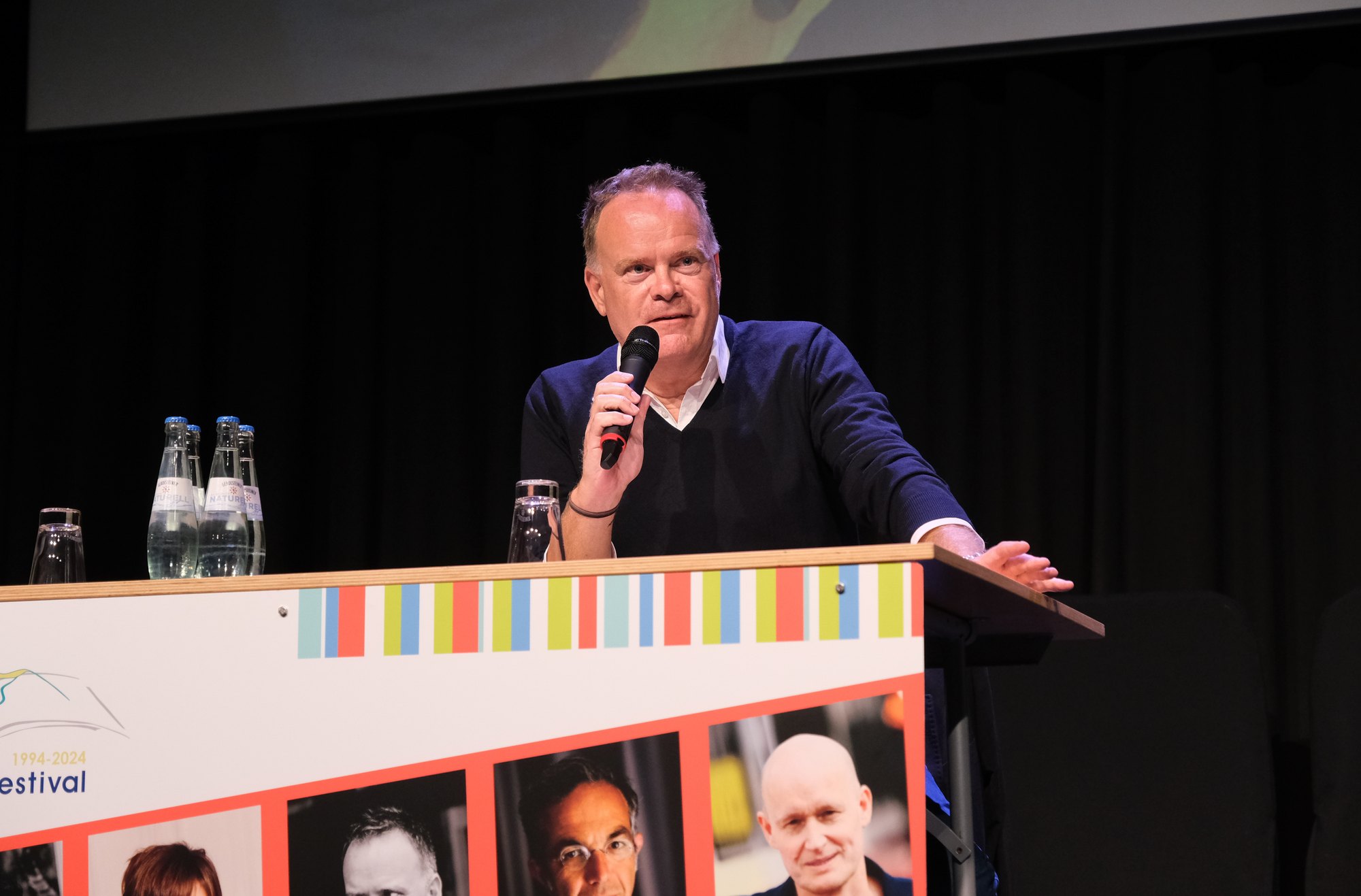 Und ZDF-heute-journal-Moderator Christian Sievers, einer der bekanntesten Journalisten Deutschlands: der schlug eine Brücke vom "Bitburger" als dem offiziellen EM-Bier zum Veranstaltungsort des Festivalabends. Lesend oder erzählend, sitzend am Autorentisch oder auf der Festivalbühne umhergehend packte er das Publikum mit kurzweiligen Erzählungen und fesselnden Lesestellen aus seinem Buch "Grauzonen". Womit er meint: eine Welt jenseits von Schwarz und Weiß, eine Welt der Differenzierungen nicht zuletzt in den Nachrichtensendungen. Und das in einer Zeit, in die Sozialen Medien die Welt mit vermeintlichen Nachrichten und Halbwahrheiten überschwemmen.