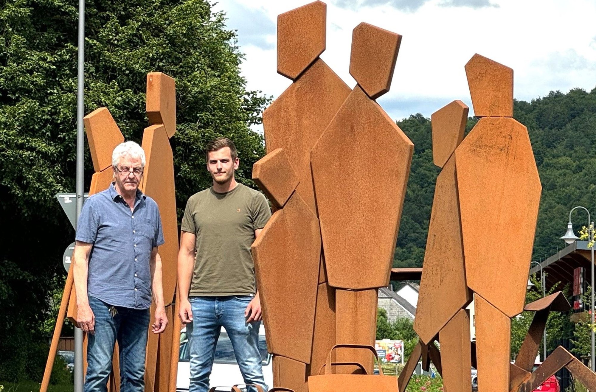 Der Niederprümer Bildhauer Hubert Kruft und sein Sohn Lukas haben ihre neue Skulptur "Willkommen in Prüm" am Kreisel beim Rewe Markt montiert und beleuchtet.
