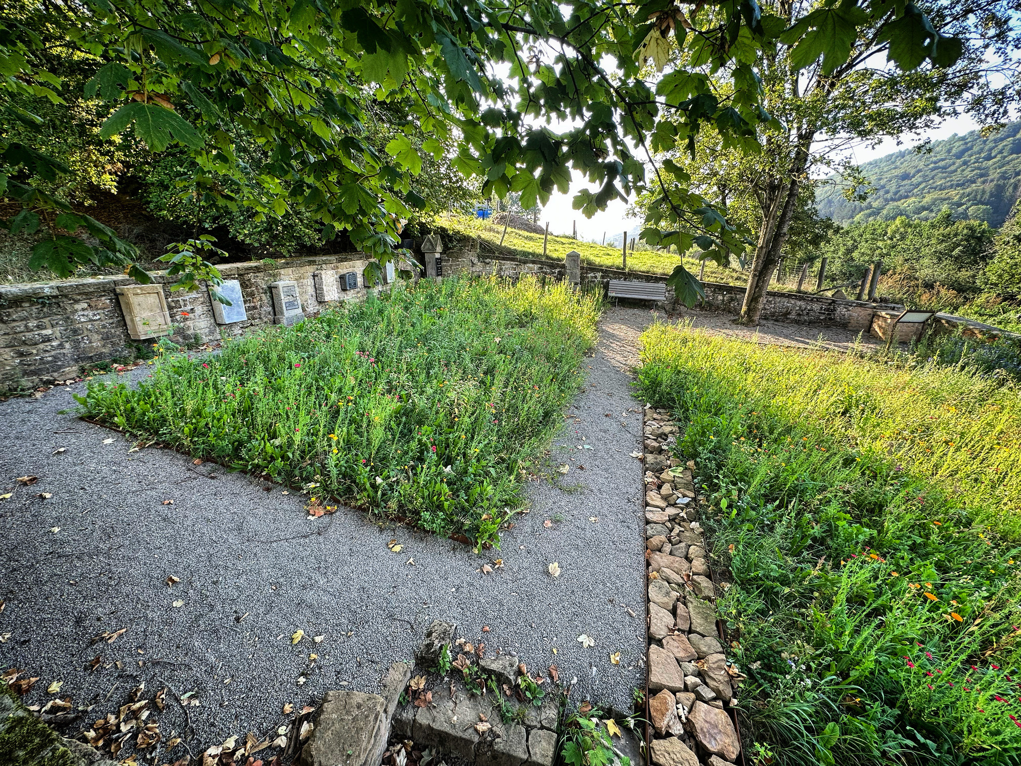 Das Projekt der "Arbeitsgemeinschaft Jüdische Geschichte Bollendorf" zur Neugestaltung der Gedenkstätte des Jüdischen Friedhofs ist nun abgeschlossen. Die Neugestaltung wurde unter anderem mit Mitteln der "Stiftung Rheinland-Pfalz für Kultur" und des Leader-Programms finanziert. Die beschrifteten Grabsteine wurden im Rahmen der Neugestaltung aus der Außenmauer geborgen und durch Platzhhalter mit eingearbeiteten Davidstern ersetzt worden. Die geborgenen Grabsteine wurden an der hinteren Friedhofsmauer aufgestellt. Zudem wurde eine Wegführung über das Gelände des Friedhofs angelegt und das Begräbnisfeld mit einer Blumenwiese ausgestattet.