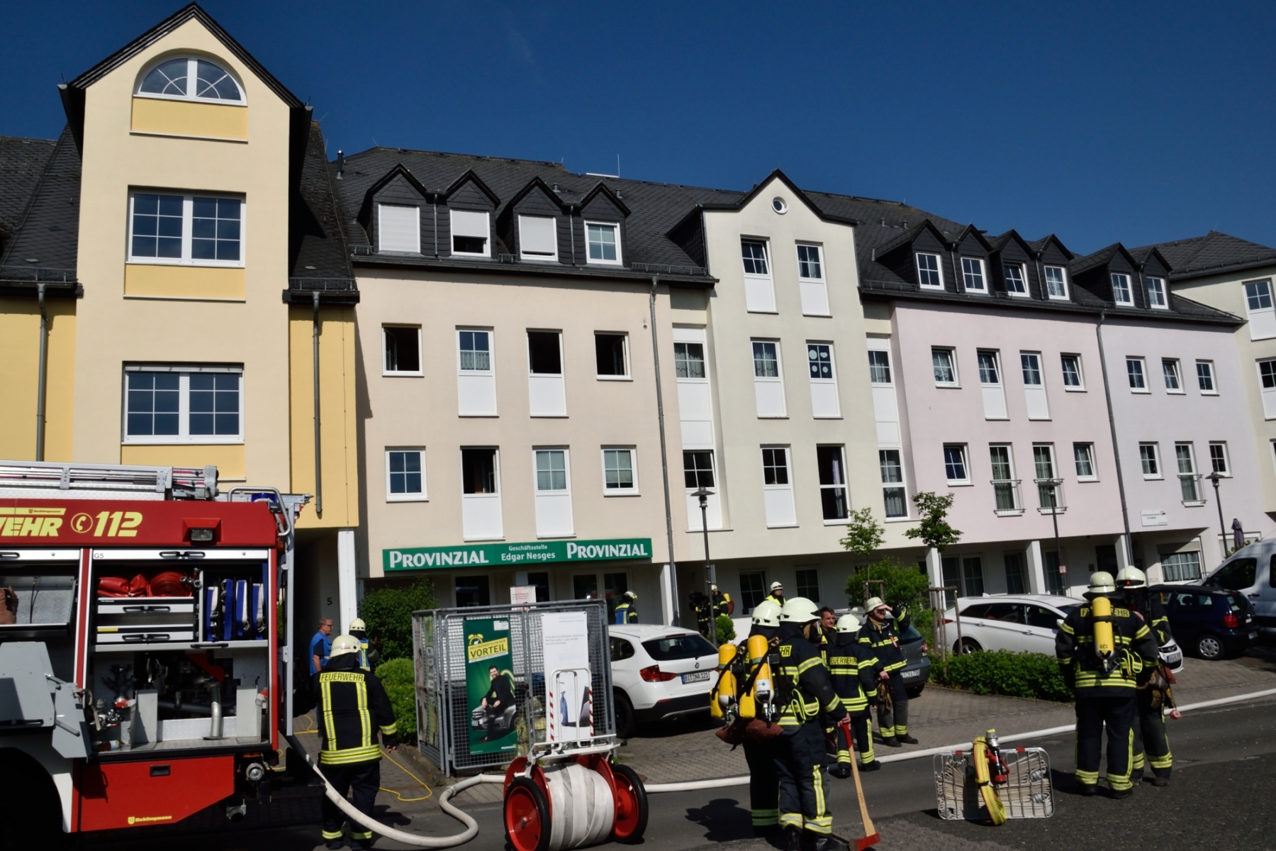 Beim Eintreffen der ersten Rettungskräfte drang Rauch aus Fenstern im ersten Stock. Die Wehren trafen in der brennenden Wohnung auf vier Personen. Eine Person wurde bei dem Brand verletzt und musste umgehend in ein Krankenhaus eingeliefert werden. Nach Auskunft von Bürgermeister Joachim Kandels war die Explosion in der Wohnung jedoch nicht auf eine Explosion in Zusammenhang mit der Haus-Gasversorgung zurückzuführen. Zur Ermittlung der Ursache wurde die Polizei Bitburg eingeschaltet. Nach Aussage von Bürgermeister Joachim Kandels bestand dank des schnellen Eingreifens der Feuerwehren zu keiner Zeit Gefahr für weitere Bewohner und das angrenzende Wohnheim der AWO.