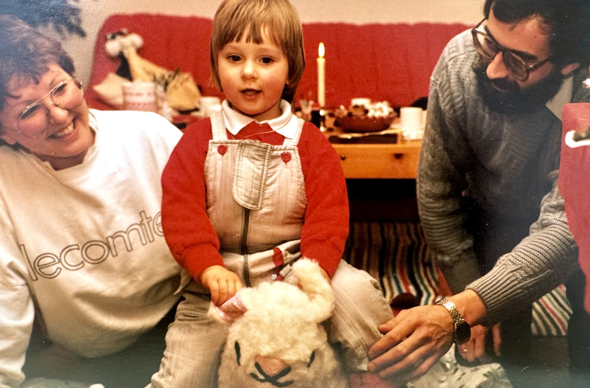 "Tatsächlich habe ich sehr viele und ausschließlich positive Kindheitserinnerungen an die Weihnachtstage. Unsere Familie feiert ganz traditionell mit gegenseitigen Besuchen, gutem Essen, Spaziergängen und Geschenken. In meiner Kindheit besuchte uns der Nikolaus und später an Heilig Abend brachte das Christkind heimlich die Geschenke in das vorher abgeschlossene Wohnzimmer. Wir konnten erst rein, wenn wir vorher für das Christkind einige Lieder gesungen hatten und die Weihnachtsglocke klingelte. Eine schöne Erinnerung habe ich an das grüne Geschenkpapier, mit dem das Geschenk unten rechts auf dem Tisch eingepackt ist. Unsere Familie hatte eine derart große Rolle von diesem Papier, dass gefühlt über Jahrzehnte gleich mehrere Geschenke pro Fest so verpackt waren. Das war quasi Reuschen-Tradition."