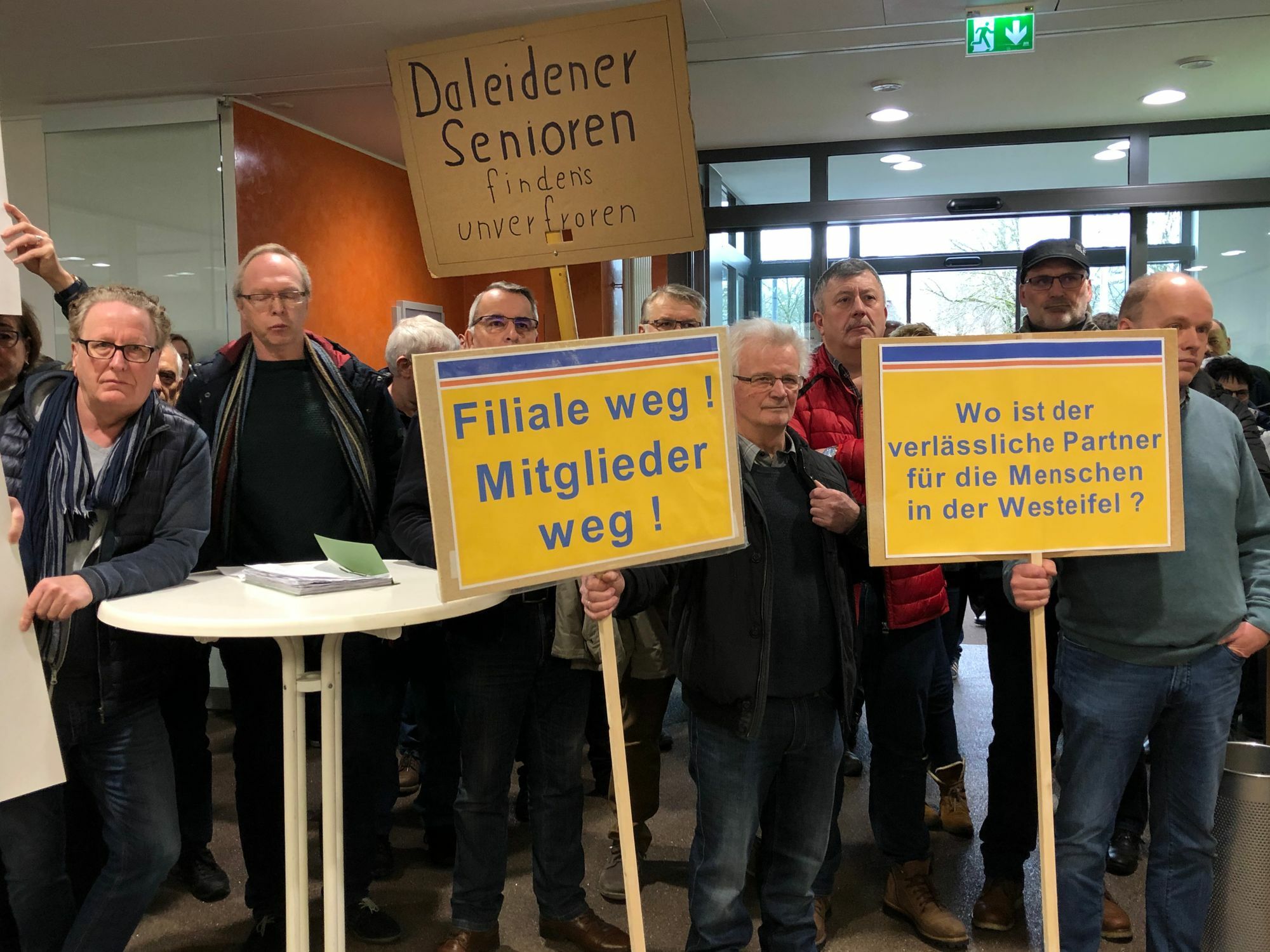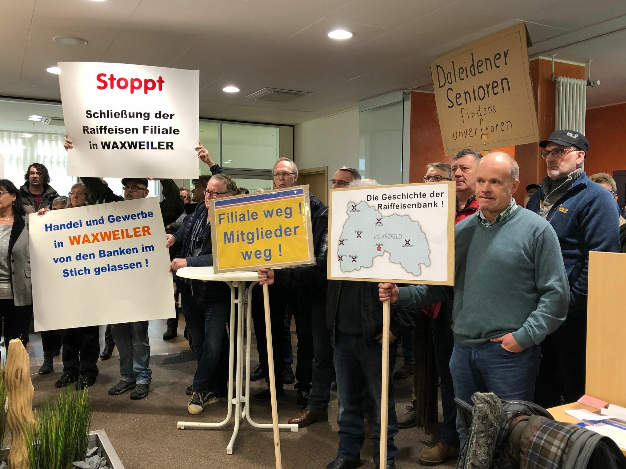 Währenddessen machten allerdings rund 100 Mitglieder der Genossenschaftsbank in der Schalterhalle allzu deutlich, dass sie alles andere als zufrieden sind. Grund: Die Raiffeisenbank Westeifel eG wird zum 31. März ihre Filialen in Daleiden und Waxweiler schließen, die Mitarbeiter ziehen um nach Pronsfeld bzw. Arzfeld.