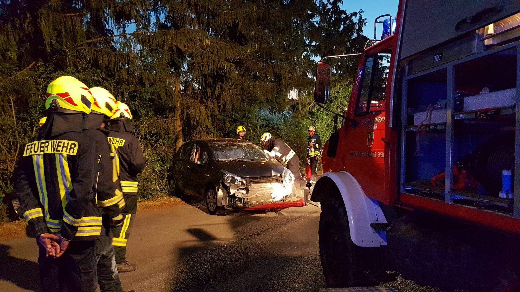 Stuntreifer Verkehrsunfall am Montagabend gegen 21.25 Uhr in Phillipsheim: Eine Autofahrerin aus den Niederlanden wollte auf der Ortsdurchfahrt in Phillipsheim wenden und fuhr dabei gegen eine Mauer. Daraufhin fuhr sie rückwärts mit Vollgas quer über die Straße, dann einen Abhang hinunter und prallte gegen einen Baum. Die Fahrerin konnte sich selber aus ihrer misslichen Lage befreien, der Beifahrer musste jedoch von der Feuerwehr befreit werden. Mit einer starken Seilwinde zog die Feuerwehr mit ihrem Rüstwagen das Fahrzeug den steilen Berg hinauf. Anschließend kümmerte sich der Notarzt um den Verletzten. Beide Personen wurden ins Krankenhaus gebracht. Über die Schwere der Verletzungen ist nichts bekannt. Am Fahrzeug entstand nicht unerheblicher Sachschaden. Die Ortsstraße war während der Rettungs und Bergungsarbeiten voll gesperrt. Im Einsatz war die Polizeiinspektion Bitburg, das DRK Speicher sowie die Rufbereitschaft aus Speicher und die Feuerwehren aus Phillipsheim und Speicher.