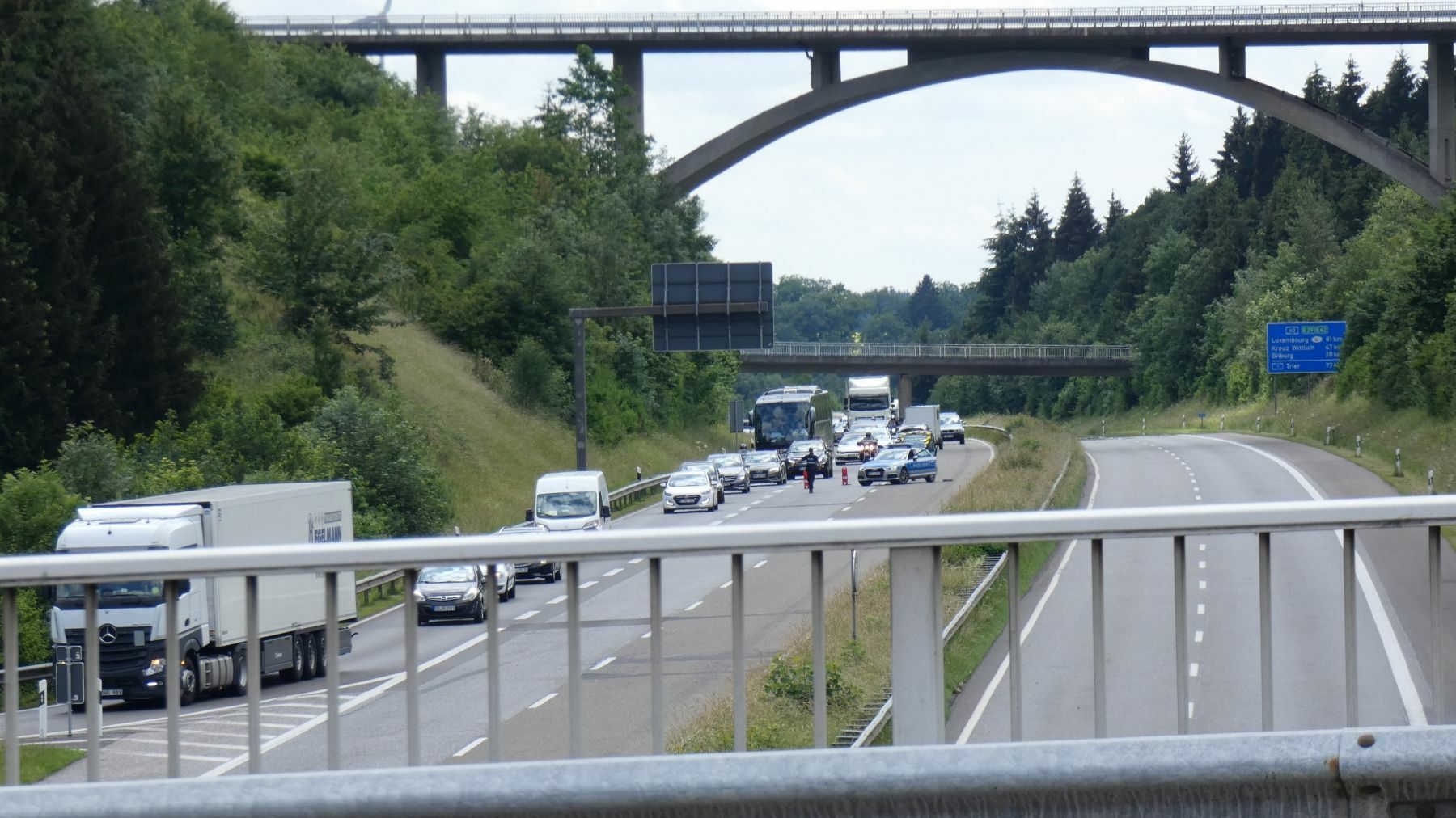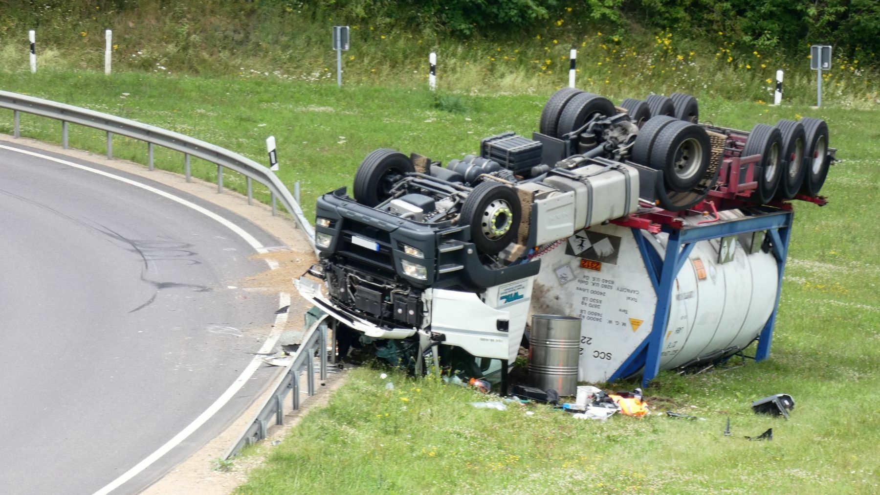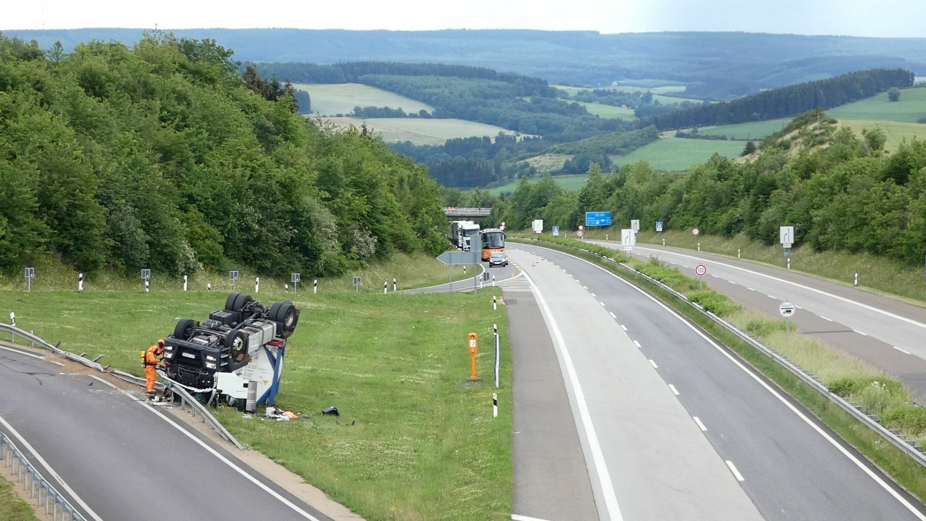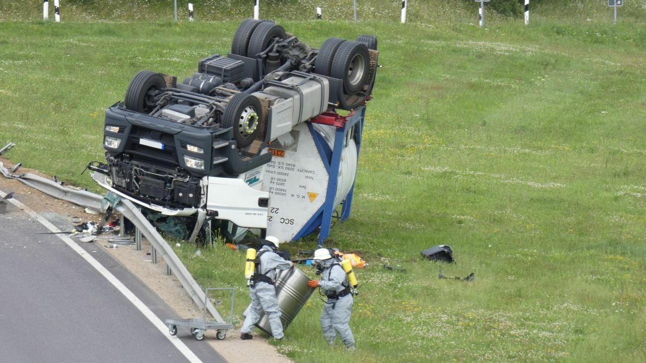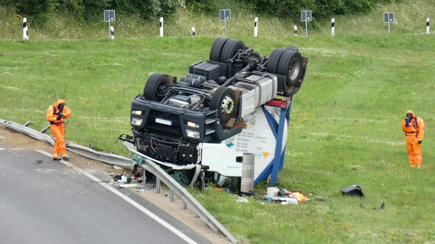 Der schwere LKW durchbrach die Leitplanke und überschlug sich und blieb auf dem Dach liegen. Der Fahrer des Gefahrguttransporter zog sich hierbei so schwere Verletzungen zu, dass er umgehend in ein Krankenhaus eingeliefert werden musste. Die ersten am Unfallort eintreffenden Rettungskräfte reklamierten austretende Gefahrstoffe. Da es sich bei dem Gefahrstoff um Phenol handelt, wurde umgehend im Umkreis von 100 Metern alles abgesperrt. Phenol wirkt sowohl lokal als auch systemisch stark toxisch; bei dermaler Exposition besitzt es eine reizende bis ätzende Wirkung auf Schleimhäute, Haut und Augen. Die Augen können Schäden in Form einer Trübung der Hornhaut, Schwellungen und Verwachsung der Lider bis zur Erblindung erleiden. Hautkontakt führt zuerst zu Hautrötung, später zu einer Weißverfärbung; längere Einwirkungszeit verursacht eine Dunkelfärbung bis zur Bildung von Nekrosen. Die Polizei richtet auf der A60 zunächst in Richtung Belgien sowohl auch in Richtung Bitburg eine Vollsperrung ein, konnte aber nach ca. 45 Minuten den Verkehr in Richtung Belgien über die Abfahrt Prüm umleiten. In der Zwischenzeit stellte der Gefahrstoffzug des Eifelkreises mit Unterstützung von Dr. Uwe Hoppe, Fachberater Chemie aus Bitburg, fest, dass der Tank des Transporters bei dem Unfall dicht und heil geblieben ist. Bei der austretenden Flüssigkeit handelte es sich um Kraftstoffe. Im Einsatz sind bis dato mehrere Feuerwehren aus dem Eifelkreis, der Gefahrstoffzug des Eifelkreis Bitburg-Prüm, das THW Bitburg, das DRK mit Orgleiter und die Berufsfeuerwehr aus Trier mit zwei Fahrzeugen. Fotos/Video: Siko