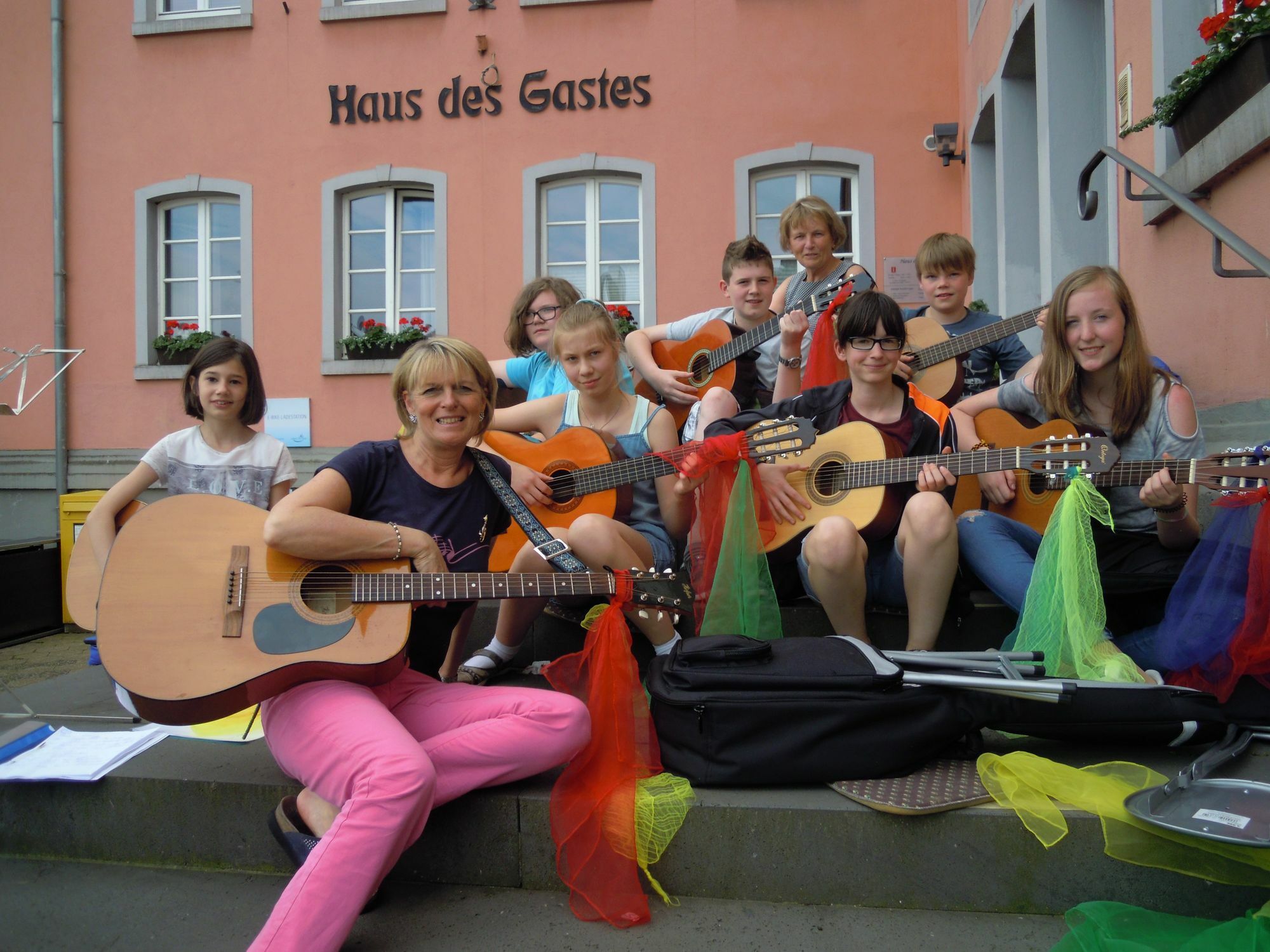 Mit Musik und durch Musik Freude schenken ist das Motto von Gitarrenlehrerin Therese Müller. In diesem Sinne sind Gitarrenschüler aus den Kindergruppen von der Volkshochschule in Prüm mit ihrer Gitarrenlehrerin Therese Müller durch die Innenstadt gezogen, um Menschen mit handgemachter Musik zu erfreuen. Dabei schauten sie auch bei der Stadtbürgermeisterin Mathilde Weinandy vorbei und musizierten vor der Prümer Touristinfo. Anschließend wanderten die Musikanten weiter durch die Stadt bis zum Seniorenheim und gaben den Senioren ein Ständchen.