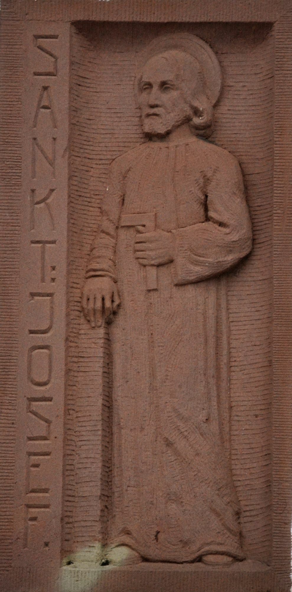 - Das Dach der seitlich gelegenen Eingangstreppe wird durch eine Sandsteinsäule gestützt.