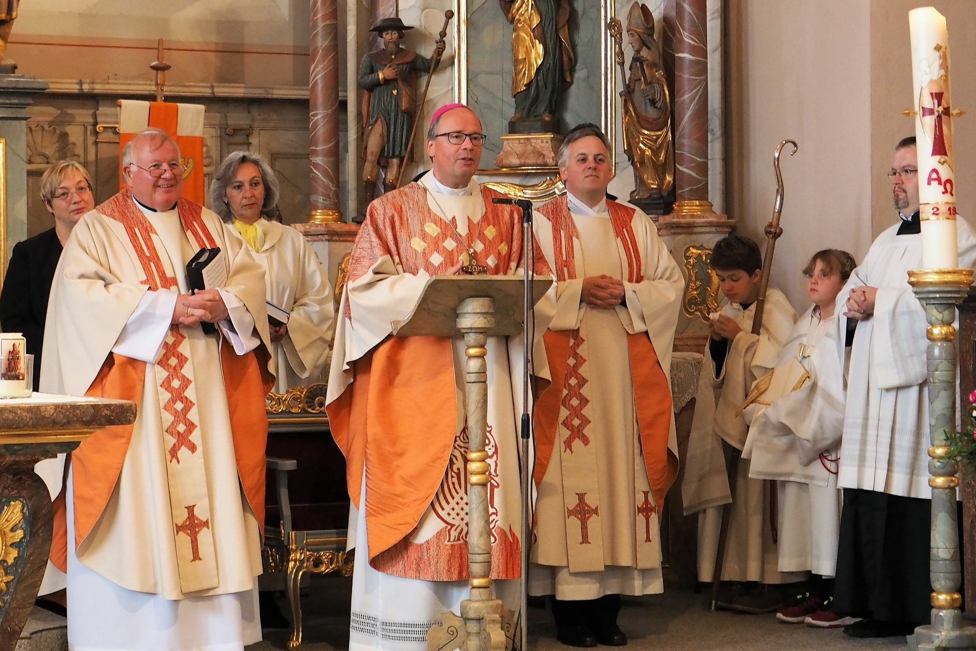 Mit einem Pontifikalamt mit Bischof Dr. Stephan Ackermann hat die Pfarrei Waxweiler am 4. November den Gedenktag des Heiligen Willibrord gefeiert. Als Patron des Dekanats St. Willibrord Westeifel hat die Verehrung des „Friesenmissionars“ Willibrord (658–739), der auch Gebiete der Westeifel missionierte, eine lange Tradition im Raum Waxweiler. Im Zentrum der bleibenden Verehrung steht jedes Jahr am Dienstag nach Pfingsten die Echternacher Springprozession zum Grab des Heiligen, deren Ursprung der Sage nach auf das Jahr 728 und den Ort Waxweiler zurückgeht. Auf die Bedeutung des angelsächsischen Missionars Willibrord für den Kontinent und sein Wirken als Glaubensbote für die Westeifel ging Bischof Ackermann in seiner Predigt ein. Er dankte für dessen Zeugnis, das dem Glauben der Menschen in der Region vermutlich „einen neuen Anschub“ gegeben habe, nachdem im Trierer Raum das Christentum schon fast 400 Jahre vertreten war. Denn der Glaube sei kein „Selbstläufer“, sagte der Bischof, weshalb er schon damals erneuert, angestoßen und gefestigt werden musste. Dass Willibrord vermutlich ein überzeugender Verkünder gewesen sei, führte Ackermann auf zwei Gründe zurück. Zum einen sei er mit elf Gefährten auf das Festland gekommen, sodass die Gemeinschaft eine Säule gewesen sei, um den Glauben weiter zu tragen – „in einer Gemeinschaft, die stärkt, und die wir auch heute suchen und pflegen müssen, wie etwa in der gemeinschaftlichen Wallfahrt nach Echternach, bei der sie gelebt wird“. Zum anderen stünden die Glaubensboten dafür, dass der Glaube nicht für sich behalten werden dürfe, „sondern ein Geschenk ist, das geteilt werden und wachsen will. Er macht das Leben, nicht nur mein eigenes, reicher und verändert die Welt zum Positiven“, sagte der Bischof und rief dazu auf, dem Beispiel der Gemeinschaft und des Teilens im Glauben zu folgen. Michael Fischer würdigte als Vorsitzender des Pfarreienrates besonders das Engagement der anwesenden „Brudermeister“, die jedes Jahr die Fußwallfahrt Prüm-Waxweiler zur Echternacher Springprozession organisieren und als Vorbeter begleiten. In einer Zeit synodaler Veränderungen im Bistum vertraue er darauf, „dass unser Heiliger auch in den zukünftigen Pfarreistrukturen ein Bindeglied der Gläubigen zueinander bleibt“, sagte Fischer in seiner Begrüßung. Der Bischof, der den Gottesdienst in der Pfarrkirche St. Johannes der Täufer mit Pfarrer Georg Josef Müller und Domvikar Marco Weber zelebrierte, bedankte sich bei der Chorgemeinschaft Schönecken/Lasel/Waxweiler unter der Gesamtleitung von Hans-Peter Gansen und beim Bundestagsabgeordneten Patrick Schnieder für die Begleitung an der Orgel. Der Heilige Willibrord (Gedenktag 7. November) ist seit 150 Jahren Patron des heutigen Dekanates St. Willibrord Westeifel, dem flächenmäßig größten im Bistum und dem einzigen, das einen Heiligen in seinem Namen trägt. Die Echternacher Springprozession wird traditionell von der Pfarrei Waxweiler mit ihren Springergruppen angeführt.