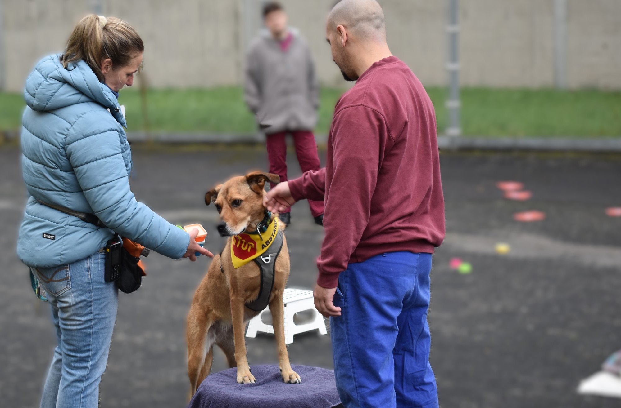 Gefängnispfarrer Johannes Arnoldi ist an diesem Montag zum ersten Mal mit dabei auf dem JVA-Hof. "Persönliches Interesse", erklärt er. Schließlich kennt er sich nicht nur mit "Menschenschäfchen", sondern auch mit Fellnasen aus, da er privat selbst einen Rettungshund führt. "Resozialisierung ist wichtig und findet bei uns in der JVA ja auch in anderen Bereichen statt", erzählt er und hilft, Parcours-Equipment wie Bälle, Hütchen und Plastikbecher an den vier Trainingsstationen zu verteilen, an denen die Häftlinge sich abwechseln. "Zum Beispiel beim Sport oder in unserem Chor, der die Gottesdienste mitgestaltet. Das ehrenamtliche Engagement von Britta Schönhofen und ihrem Team finde ich jedenfalls großartig. Es könnte fast eine Therapie gegen Frust sein", fügt er hinzu. Außerdem würden Einfühlungsvermögen und Geduld trainiert. "Das Training hier hilft den Männern, wieder in die Spur zurückzufinden."