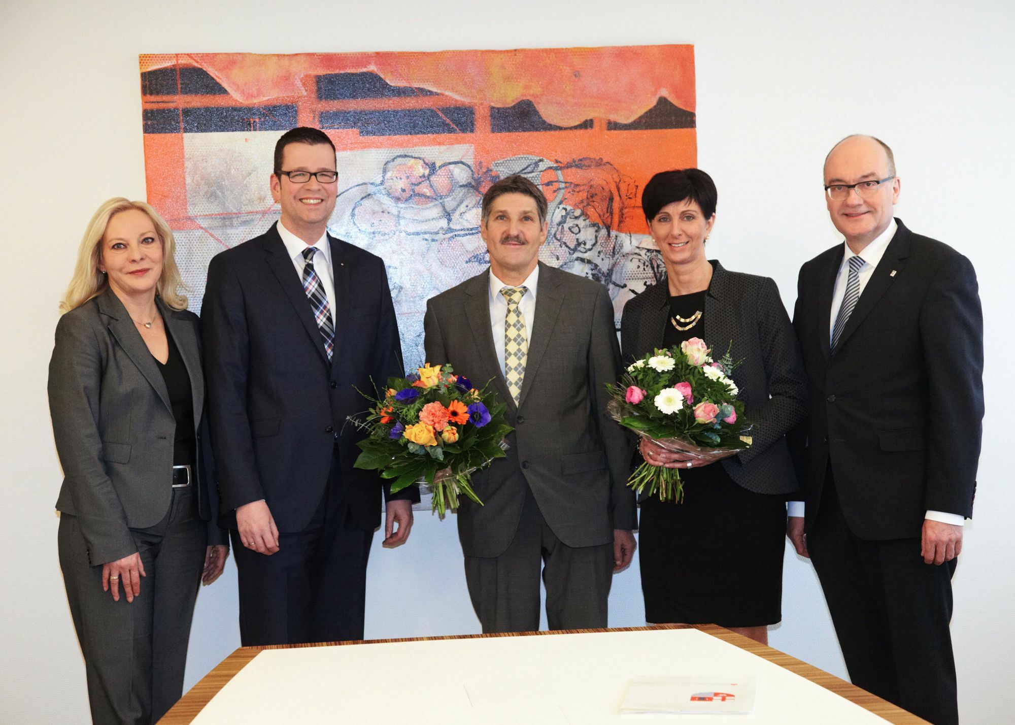 In einer Feierstunde ehrte die Kreissparkasse Bitburg-Prüm die langjährigen Beschäftigten Gerd Jacoby für seine 40-jährige und Claudia Krämer für ihre 25-jährige Tätigkeit. Gerd Jacoby begann seine Tätigkeit in der fahrbaren Geschäftsstelle, ehe er im Dezember 1988 zur Filiale Bleialf wechselte. Claudia Krämer nahm ihre Tätigkeit 1999 in der Kreditabteilung auf und betreut heute die Kunden in der Filiale Prüm als Serviceberaterin. In seiner Dankesrede würdigte Ingolf Bermes, Vorsitzender des Vorstandes, den Werdegang der Mitarbeiter und dankte für das Engagement, das zur positiven Entwicklung der Sparkasse beigetragen habe. Diesen Worten schlossen sich Andrea Kleis, Personalratsvorsitzende, und Stefan Krämer, Personalmanagement, an und wünschten eine weiterhin gute Zusammenarbeit. Foto: Kreissparkasse